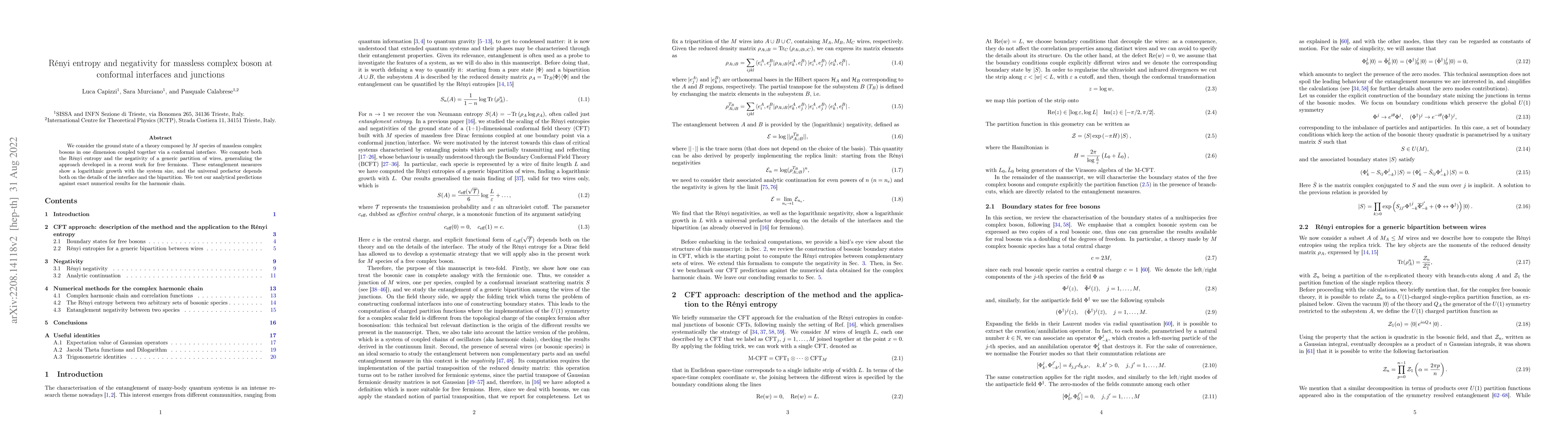 This paper computes R\'enyi entropy and negativity for a one-dimensional system of massless complex bosons at conformal interfaces, showing logarithmic growth in entanglement measures with universal prefactors dependent on interface details and bipartition. Analytical results are validated against numerical simulations of the harmonic chain.
