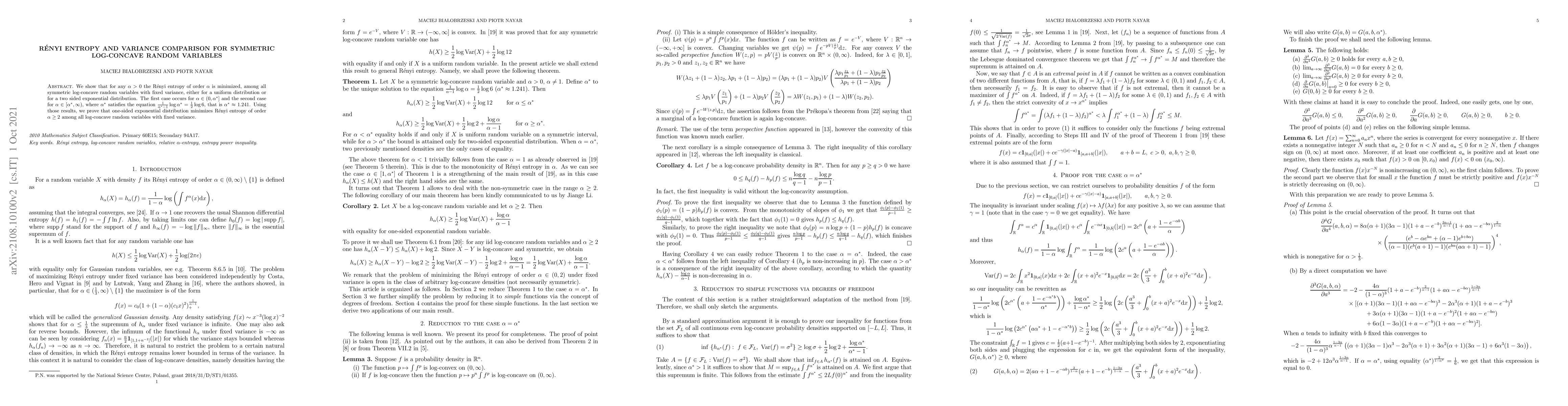 We show that for any $\alpha>0$ the R\'enyi entropy of order $\alpha$ is minimized, among all symmetric log-concave random variables with fixed variance, either for a uniform distribution or for a two sided exponential distribution. The first case occurs for $\alpha \in (0,\alpha^*]$ and the second case for $\alpha \in [\alpha^*,\infty)$, where $\alpha^*$ satisfies the equation $\frac{1}{\alpha^*-1}\log \alpha^*= \frac12 \log 6$, that is $\alpha^* \approx 1.241$. Using those results, we prove that one-sided exponential distribution minimizes R\'enyi entropy of order $\alpha \geq 2$ among all log-concave random variables with fixed variance.