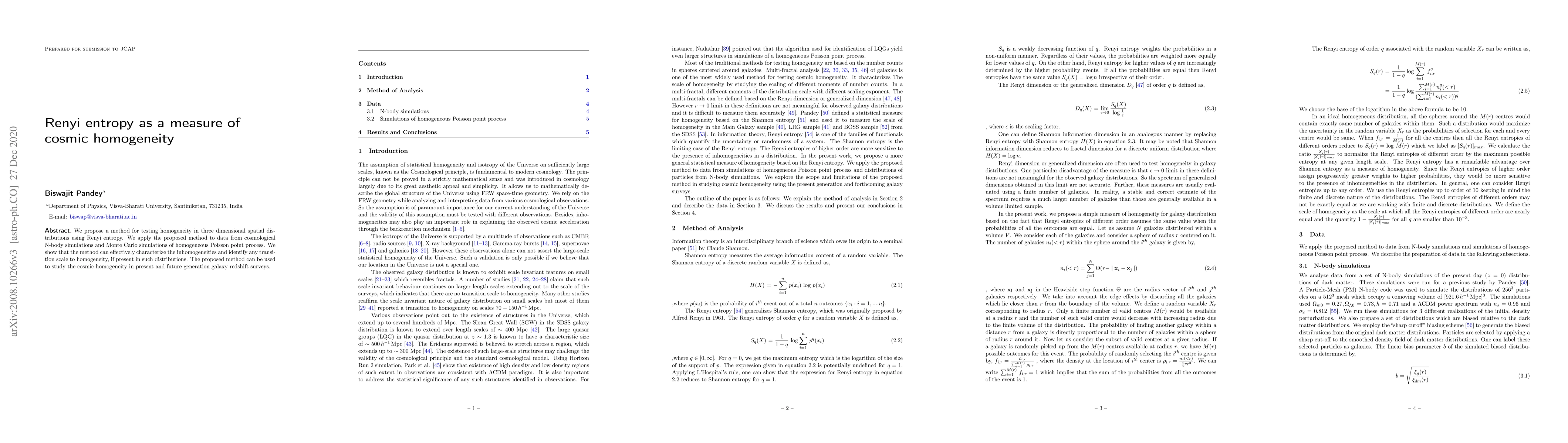 This research proposes using Renyi entropy to measure cosmic homogeneity in 3D spatial distributions, identifying transition scales to homogeneity in simulations.