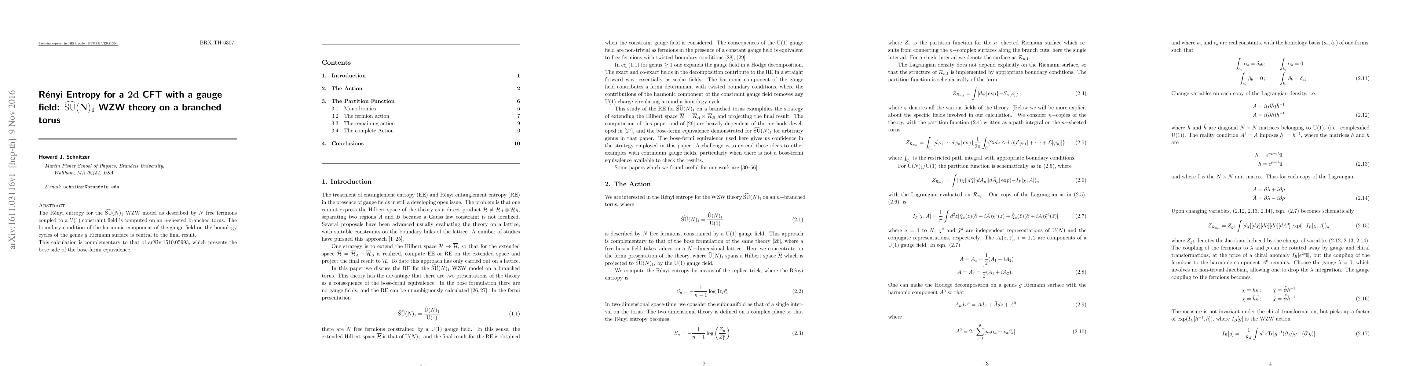 Summary: This paper computes the R\'enyi entropy for the $\widehat{\rm SU}(N)_1$ WZW model on an $n$-sheeted branched torus, focusing on the boundary condition of the gauge field's harmonic component, which is crucial for the final result. This work complements the study of the bose side of the bose-fermi equivalence in arXiv:1510.05993.