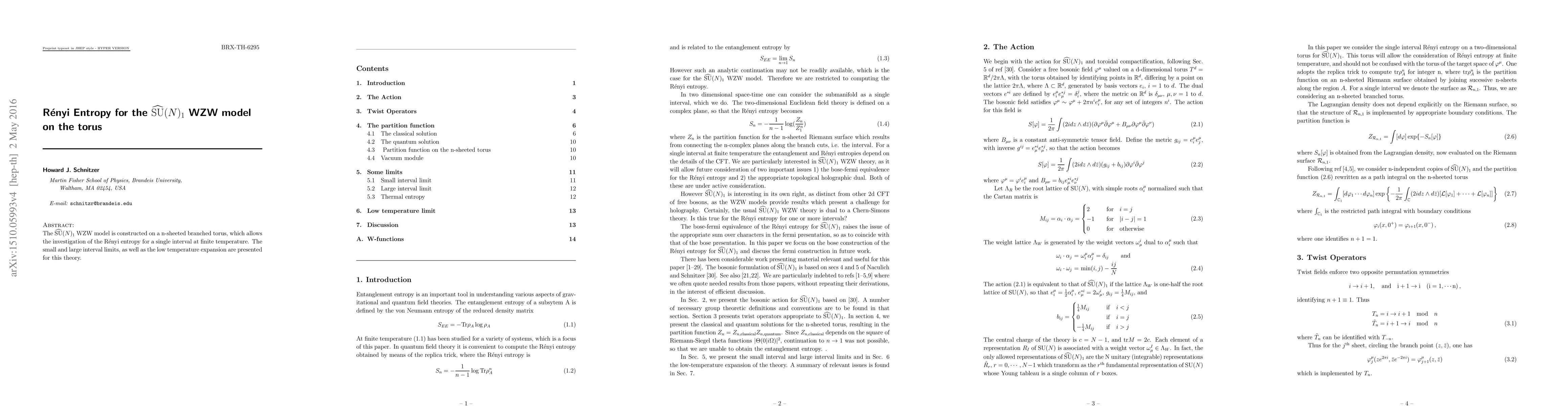 The $\sun1$ WZW model is constructed on a n-sheeted branched torus, which allows the investigation of the R\'enyi entropy for a single interval at finite temperature. The small and large interval limits, as well as the low temperature expansion are presented for this theory.