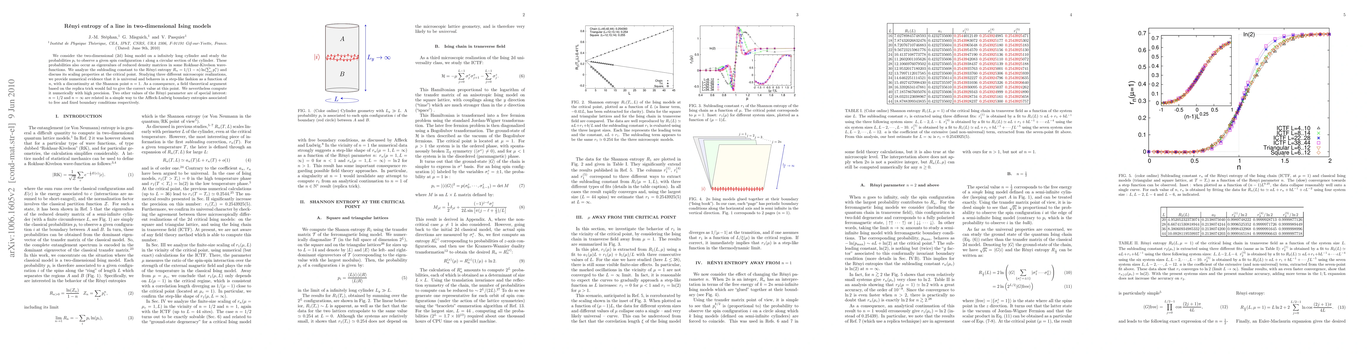 We consider the two-dimensional (2d) Ising model on a infinitely long cylinder and study the probabilities $p_i$ to observe a given spin configuration $i$ along a circular section of the cylinder. These probabilities also occur as eigenvalues of reduced density matrices in some Rokhsar-Kivelson wave-functions. We analyze the subleading constant to the R\'enyi entropy $R_n=1/(1-n) \ln (\sum_i p_i^n)$ and discuss its scaling properties at the critical point. Studying three different microscopic realizations, we provide numerical evidence that it is universal and behaves in a step-like fashion as a function of $n$, with a discontinuity at the Shannon point $n=1$. As a consequence, a field theoretical argument based on the replica trick would fail to give the correct value at this point. We nevertheless compute it numerically with high precision. Two other values of the R\'enyi parameter are of special interest: $n=1/2$ and $n=\infty$ are related in a simple way to the Affleck-Ludwig boundary entropies associated to free and fixed boundary conditions respectively.