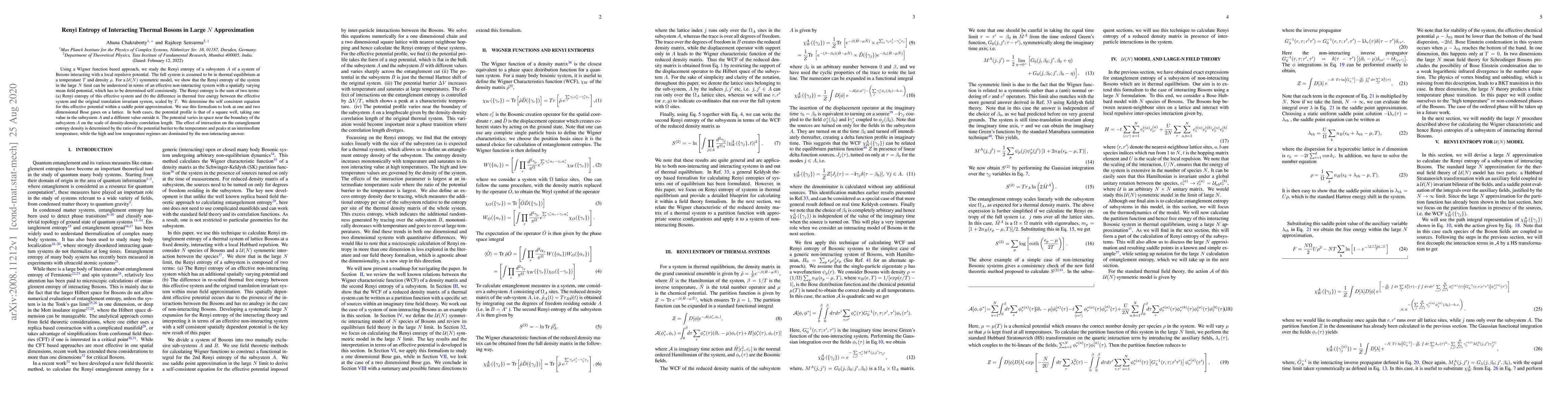 This paper explores the Renyi entropy of interacting thermal bosons in a large $N$ approximation using a Wigner function approach. It reveals that the Renyi entropy can be decomposed into an effective non-interacting system's entropy and a thermal free energy difference, determined via a self-consistent potential profile. The study applies this to one and two-dimensional Bose gases, showing interaction effects on entanglement entropy density peak at an intermediate temperature.