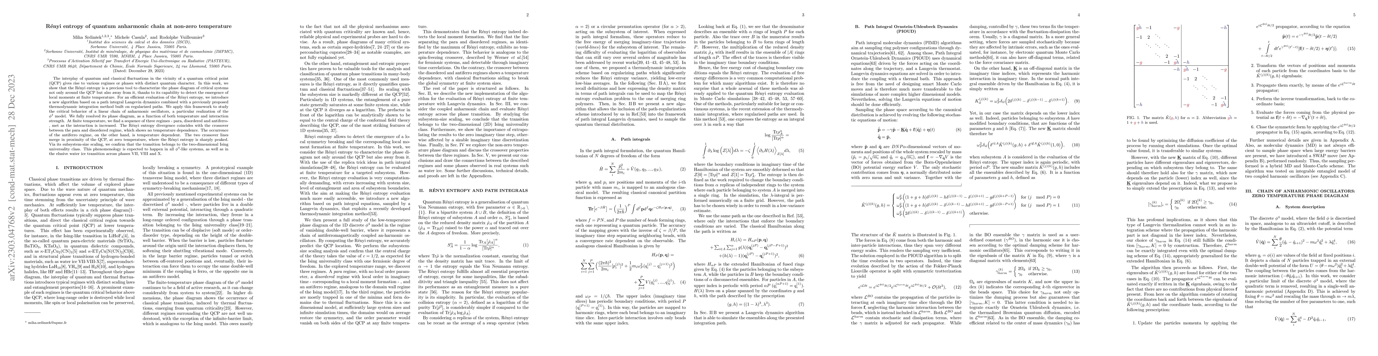 This paper investigates the R\'enyi entropy to characterize the phase diagram of a quantum anharmonic chain at non-zero temperatures, revealing three regimes: para, disordered, and quasi long-range ordered. The study employs a new algorithm combining path integral Langevin dynamics and thermodynamic integration, confirming the transition's Ising universality class near the quantum critical point.