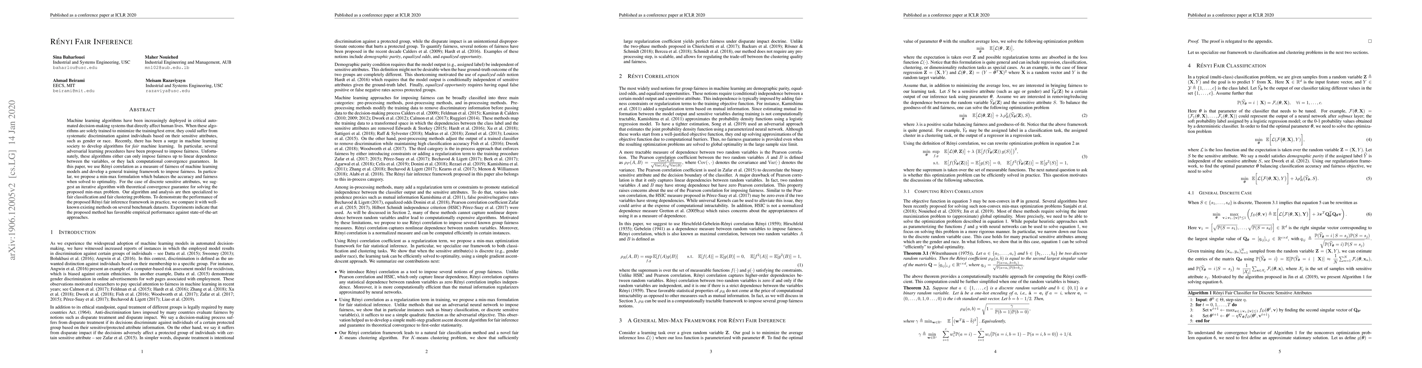 Machine learning algorithms have been increasingly deployed in critical automated decision-making systems that directly affect human lives. When these algorithms are only trained to minimize the training/test error, they could suffer from systematic discrimination against individuals based on their sensitive attributes such as gender or race. Recently, there has been a surge in machine learning society to develop algorithms for fair machine learning. In particular, many adversarial learning procedures have been proposed to impose fairness. Unfortunately, these algorithms either can only impose fairness up to first-order dependence between the variables, or they lack computational convergence guarantees. In this paper, we use R\'enyi correlation as a measure of fairness of machine learning models and develop a general training framework to impose fairness. In particular, we propose a min-max formulation which balances the accuracy and fairness when solved to optimality. For the case of discrete sensitive attributes, we suggest an iterative algorithm with theoretical convergence guarantee for solving the proposed min-max problem. Our algorithm and analysis are then specialized to fair classification and the fair clustering problem under disparate impact doctrine. Finally, the performance of the proposed R\'enyi fair inference framework is evaluated on Adult and Bank datasets.