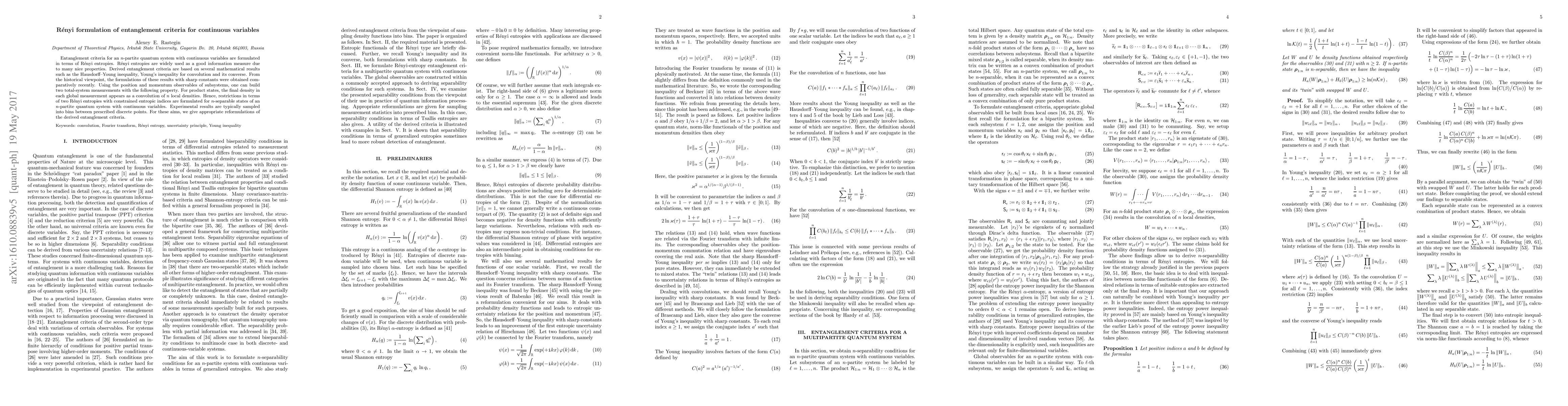 This paper formulates entanglement criteria for continuous variable quantum systems using Rényi entropies, leveraging mathematical results such as the Hausdorff-Young inequality. It provides constraints based on two Rényi entropies for $n$-partite systems and reformulates these criteria for practical experimental sampling.