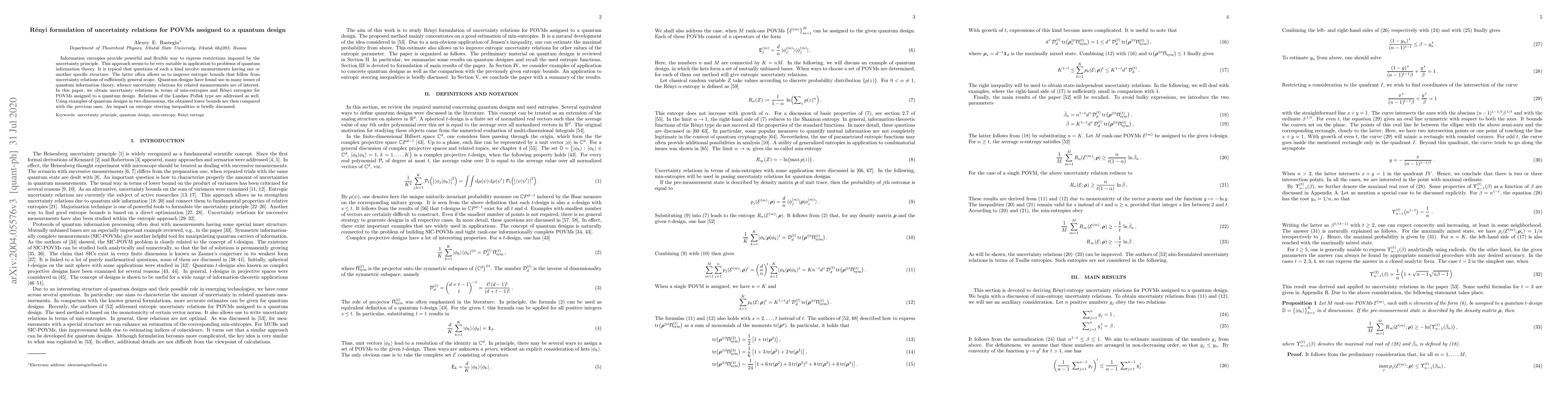 This paper derives uncertainty relations in terms of min-entropies and Rényi entropies for Positive Operator Valued Measurements (POVMs) in quantum designs. The study also addresses Landau-Pollak type relations and compares the derived lower bounds with previous results, highlighting the impact on entropic steering inequalities.