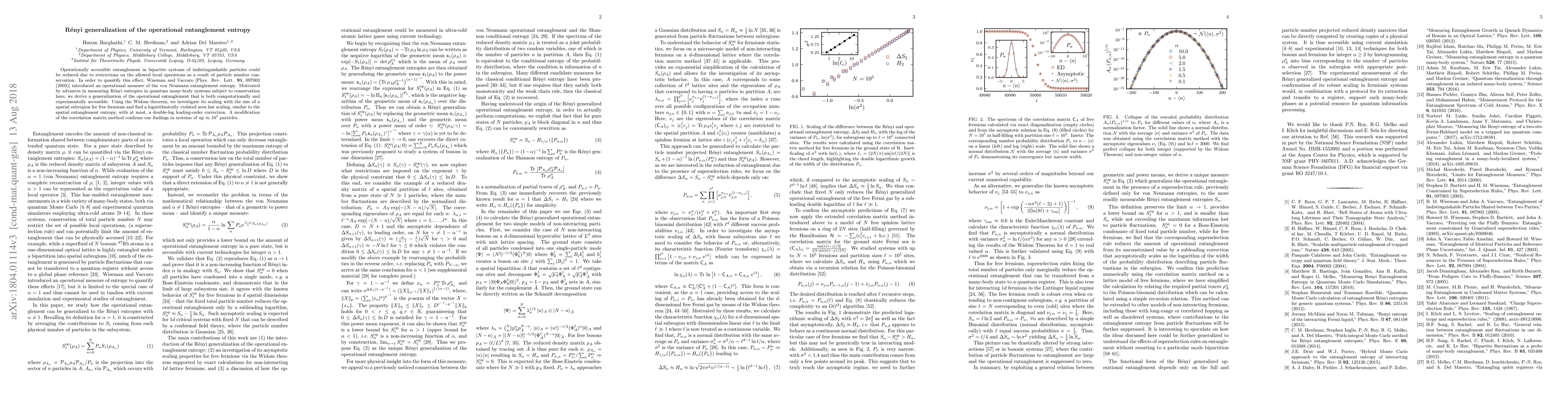 This paper generalizes the operational entanglement entropy to Rényi entropy, providing a measure that is both computationally and experimentally accessible for systems with particle number conservation. The authors find a logarithmically violated area law scaling for free fermions, similar to spatial entanglement entropy, with a double-log leading-order correction.