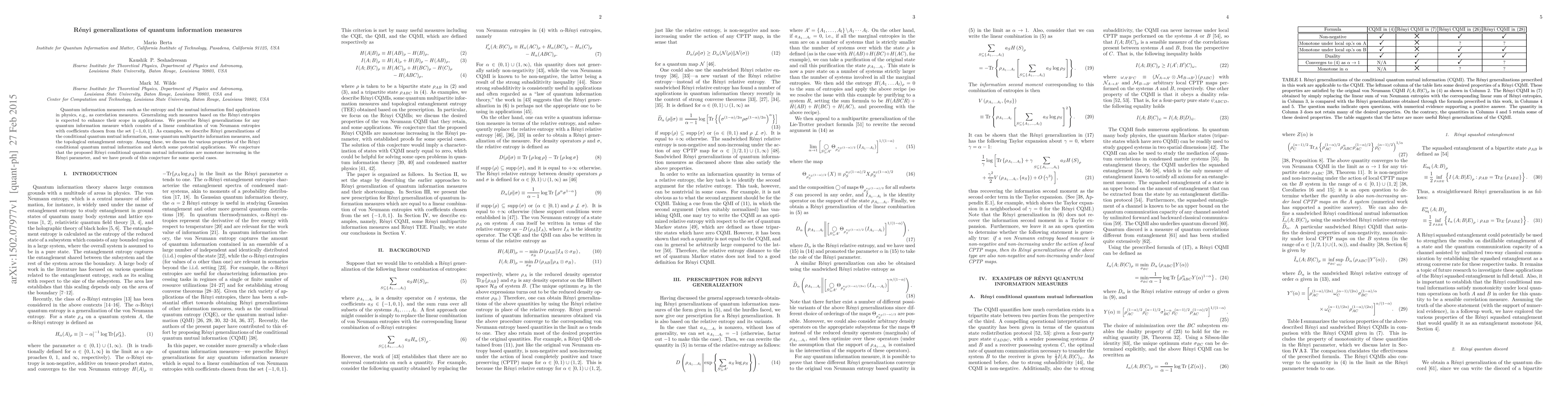 This paper generalizes quantum information measures, such as entropy and mutual information, using R\'enyi entropies, enhancing their applicability. It proposes R\'enyi versions of various quantum information measures, discusses their properties, and conjectures monotonicity in the R\'enyi parameter, with proofs for specific cases.