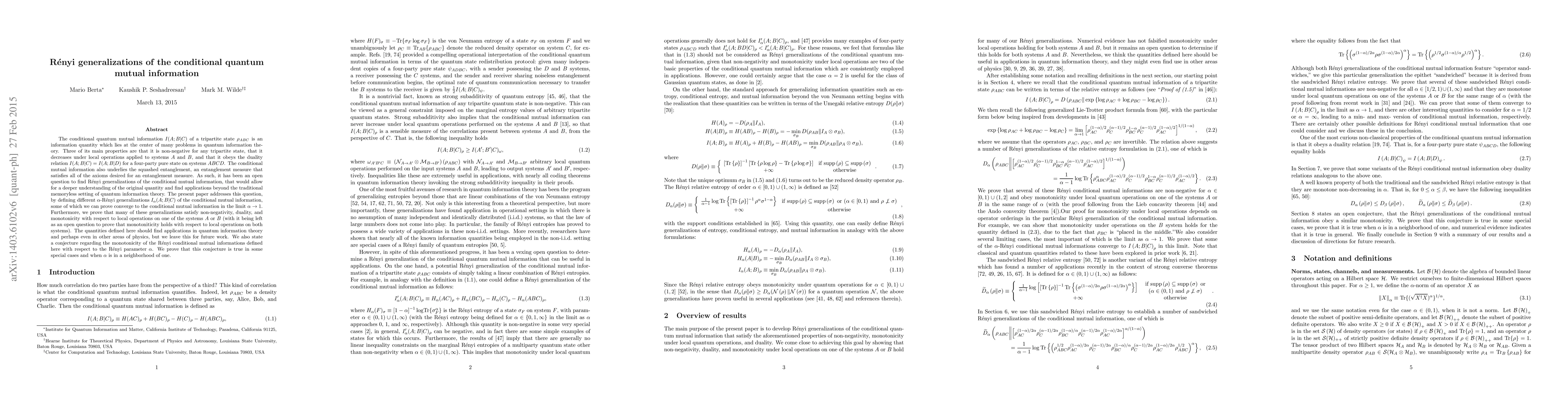 This paper defines $\alpha$-Rényi generalizations of the conditional quantum mutual information $I(A;B|C)$, proving their non-negativity, duality, and monotonicity under local operations on one system. It conjectures monotonicity with respect to the Rényi parameter $\alpha$ and verifies this in special cases and near $\alpha=1$.