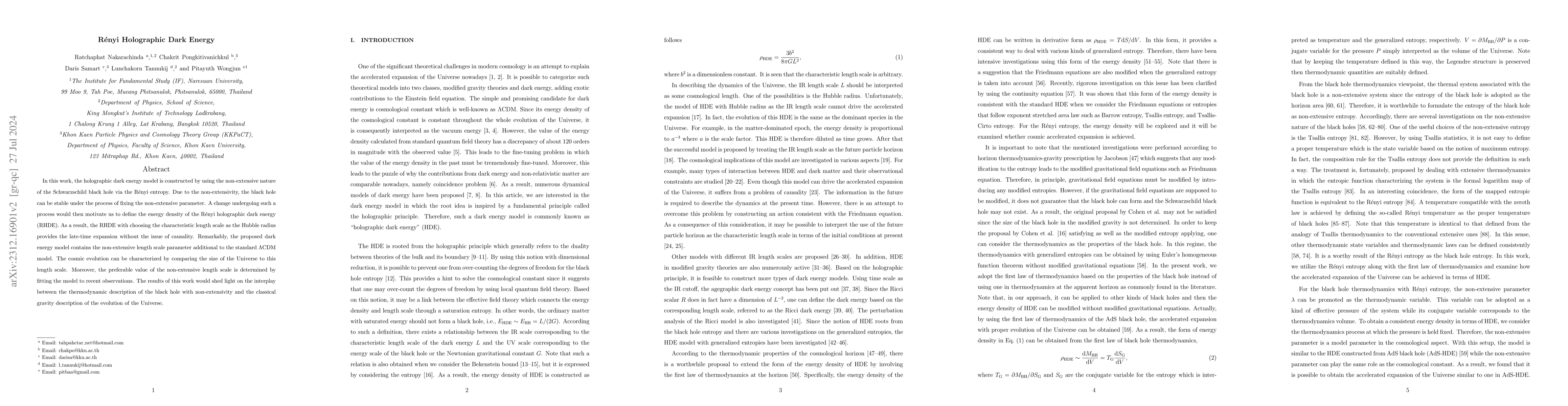 This paper constructs a holographic dark energy model using R\'enyi entropy from non-extensive Schwarzschild black holes, introducing a non-extensive length scale parameter. The model explains late-time expansion without causality issues and fits recent observations to determine the preferable value of this length scale.