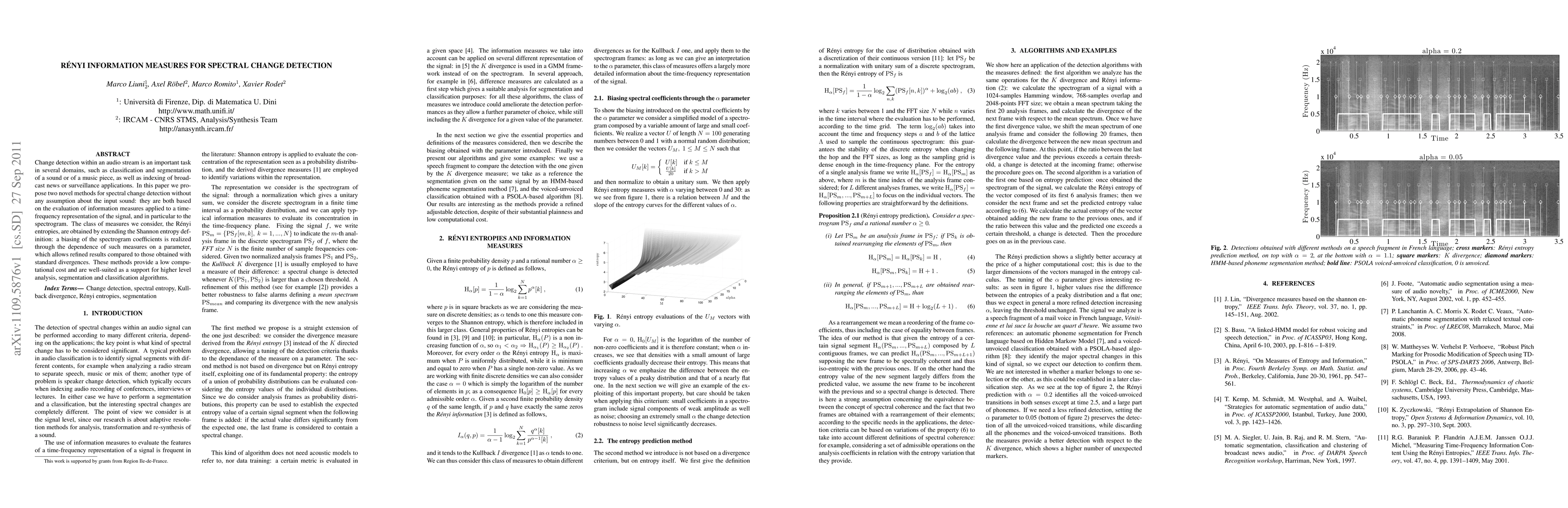Change detection within an audio stream is an important task in several domains, such as classification and segmentation of a sound or of a music piece, as well as indexing of broadcast news or surveillance applications. In this paper we propose two novel methods for spectral change detection without any assumption about the input sound: they are both based on the evaluation of information measures applied to a time- frequency representation of the signal, and in particular to the spectrogram. The class of measures we consider, the R\'enyi entropies, are obtained by extending the Shannon entropy definition: a biasing of the spectrogram coefficients is realized through the dependence of such measures on a parameter, which allows refined results compared to those obtained with standard divergences. These methods provide a low computational cost and are well-suited as a support for higher level analysis, segmentation and classification algorithms.