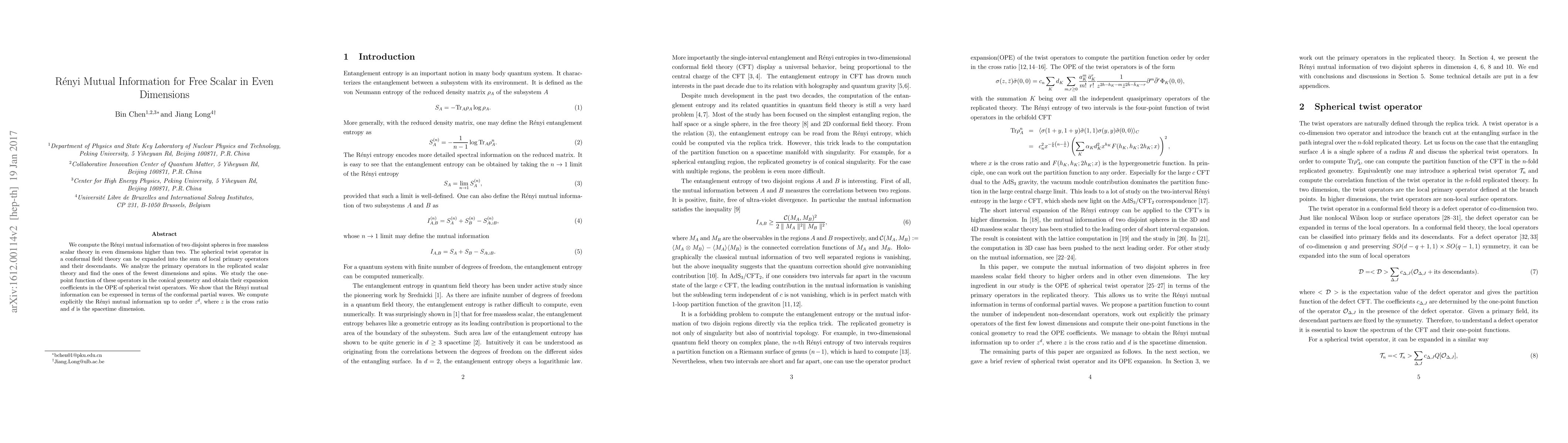 This paper computes the R\'enyi mutual information for two disjoint spheres in free massless scalar theory in even dimensions, expressing it in terms of conformal partial waves and determining it explicitly up to a certain order. The analysis focuses on the primary operators and their contributions in the replicated scalar theory.