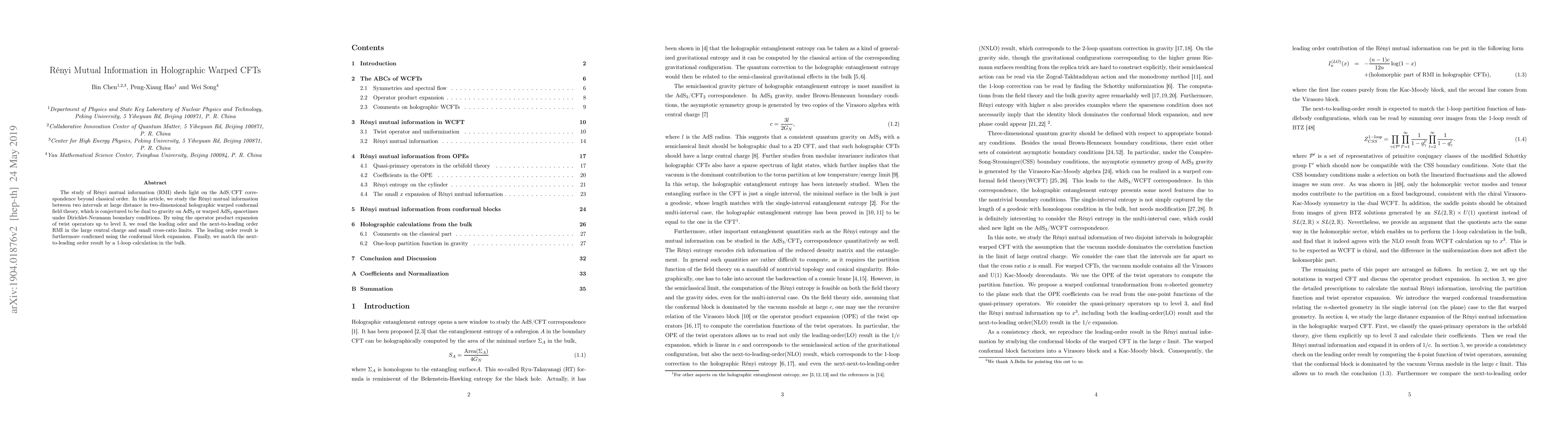 This paper investigates R\'enyi mutual information in holographic warped conformal field theories, revealing insights into the AdS/CFT correspondence beyond classical order. The study computes leading and next-to-leading order R\'enyi mutual information for two distant intervals, confirming results through operator product expansion and matching with a 1-loop bulk calculation.