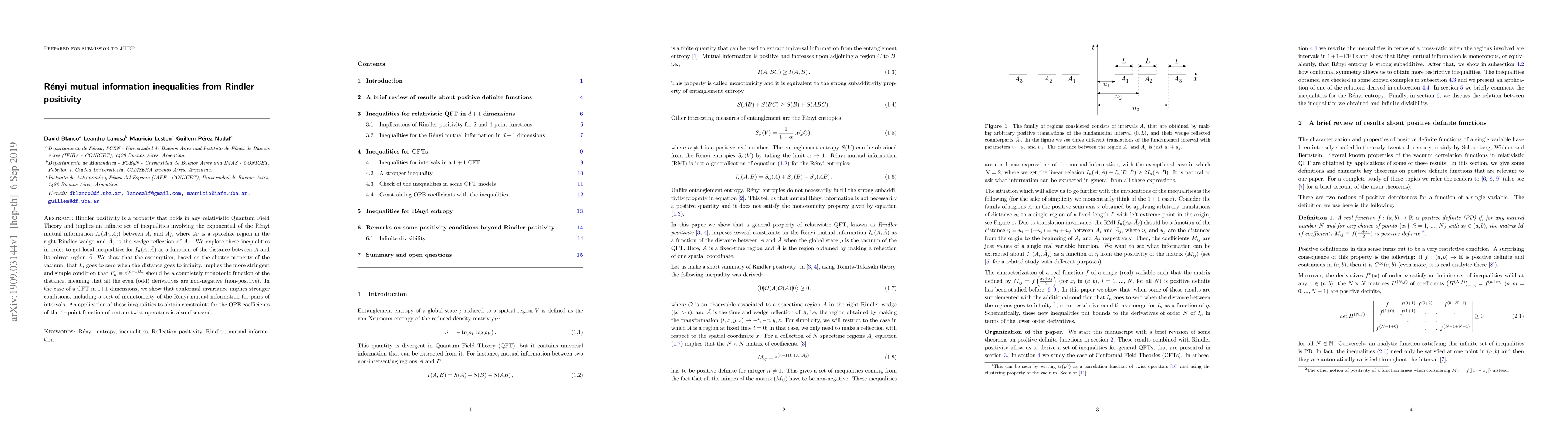 This paper explores Rindler positivity in relativistic Quantum Field Theory to derive inequalities for Rényi mutual information between spacelike regions. It shows that the cluster property implies $F_n \equiv e^{(n-1)I_n}$ must be completely monotonic with respect to distance, and in 1+1 dimensions, conformal invariance imposes stronger conditions on Rényi mutual information.