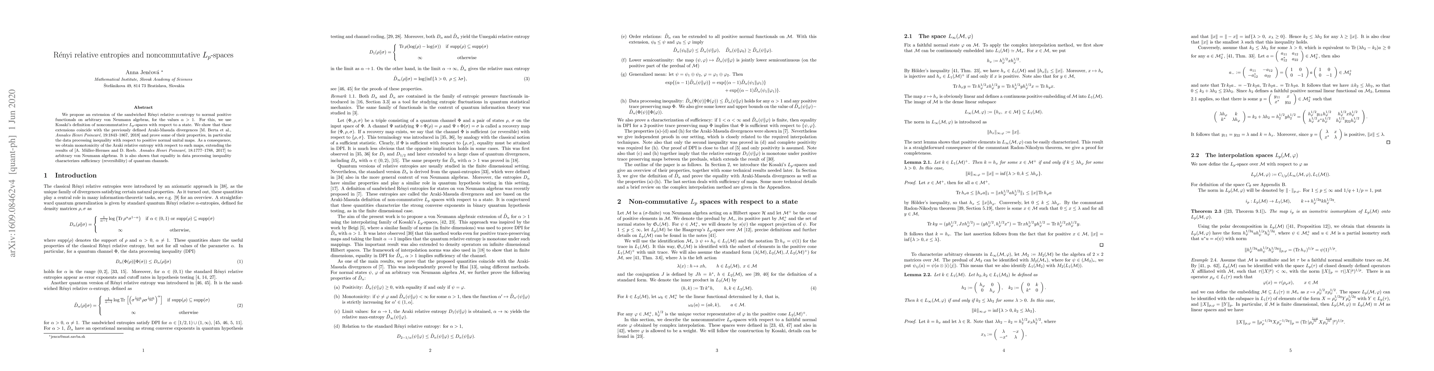 We propose an extension of the sandwiched R\'enyi relative $\alpha$-entropy to normal positive functionals on arbitrary von Neumann algebras, for the values $\alpha>1$. For this, we use Kosaki's definition of noncommutative $L_p$-spaces with respect to a state. We show that these extensions coincide with the previously defined Araki-Masuda divergences [M. Berta et al., Annales Henri Poincar\'e, 19:1843--1867, 2018] and prove some of their properties, in particular the data processing inequality with respect to positive normal unital maps. As a consequence, we obtain monotonicity of the Araki relative entropy with respect to such maps, extending the results of [A. M\"uller-Hermes and D. Reeb. Annales Henri Poincar\'e,18:1777--1788, 2017] to arbitrary von Neumann algebras. It is also shown that equality in data processing inequality characterizes sufficiency (reversibility) of quantum channels.