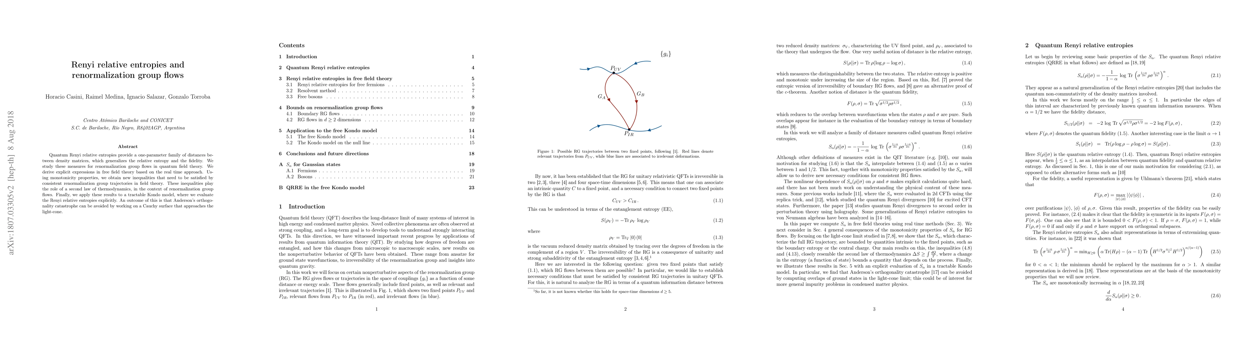 This paper investigates Quantum Renyi relative entropies in the context of renormalization group flows in quantum field theory, deriving new inequalities that serve as a second law for these flows. The study applies these insights to a Kondo model, demonstrating that Anderson's orthogonality catastrophe can be circumvented through specific Cauchy surface choices.