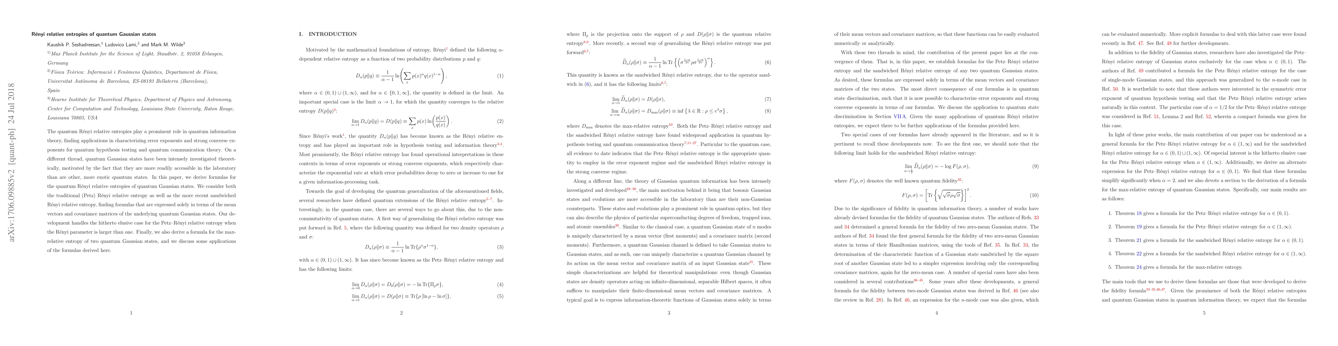 This paper derives formulas for quantum Renyi relative entropies of quantum Gaussian states, including the Petz and sandwiched versions, expressed in terms of mean vectors and covariance matrices. It resolves previous challenges in calculating the Petz-Renyi relative entropy for Renyi parameters greater than one and discusses potential applications in quantum information theory.