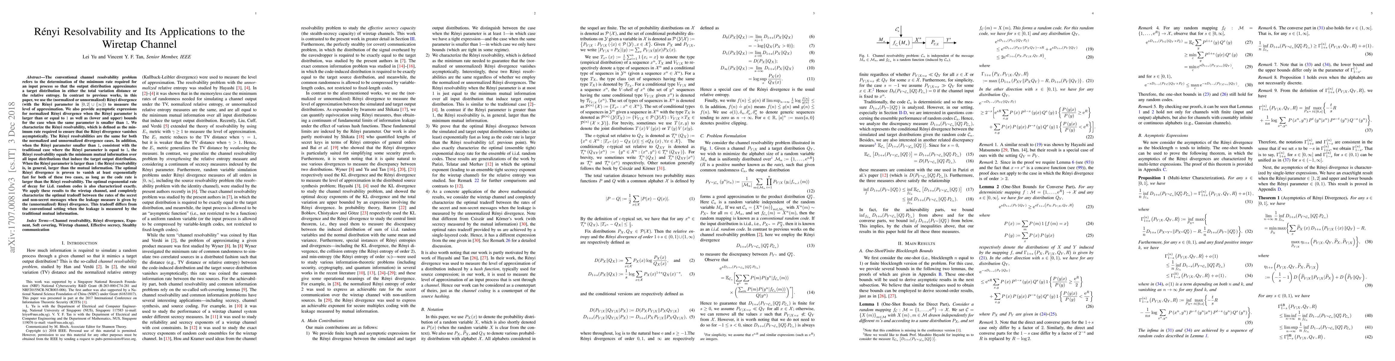 The conventional channel resolvability problem refers to the determination of the minimum rate required for an input process so that the output distribution approximates a target distribution in either the total variation distance or the relative entropy. In contrast to previous works, in this paper, we use the (normalized or unnormalized) R\'enyi divergence (with the R\'enyi parameter in $[0,2]\cup\{\infty\}$) to measure the level of approximation. We also provide asymptotic expressions for normalized R\'enyi divergence when the R\'enyi parameter is larger than or equal to $1$ as well as (lower and upper) bounds for the case when the same parameter is smaller than $1$. We characterize the R\'enyi resolvability, which is defined as the minimum rate required to ensure that the R\'enyi divergence vanishes asymptotically. The R\'enyi resolvabilities are the same for both the normalized and unnormalized divergence cases. In addition, when the R\'enyi parameter smaller than~$1$, consistent with the traditional case where the R\'enyi parameter is equal to~$1$, the R\'enyi resolvability equals the minimum mutual information over all input distributions that induce the target output distribution. When the R\'enyi parameter is larger than $1$ the R\'enyi resolvability is, in general, larger than the mutual information. The optimal R\'enyi divergence is proven to vanish at least exponentially fast for both of these two cases, as long as the code rate is larger than the R\'enyi resolvability. The optimal exponential rate of decay for i.i.d.\ random codes is also characterized exactly. We apply these results to the wiretap channel, and completely characterize the optimal tradeoff between the rates of the secret and non-secret messages when the leakage measure is given by the (unnormalized) R\'enyi divergence.