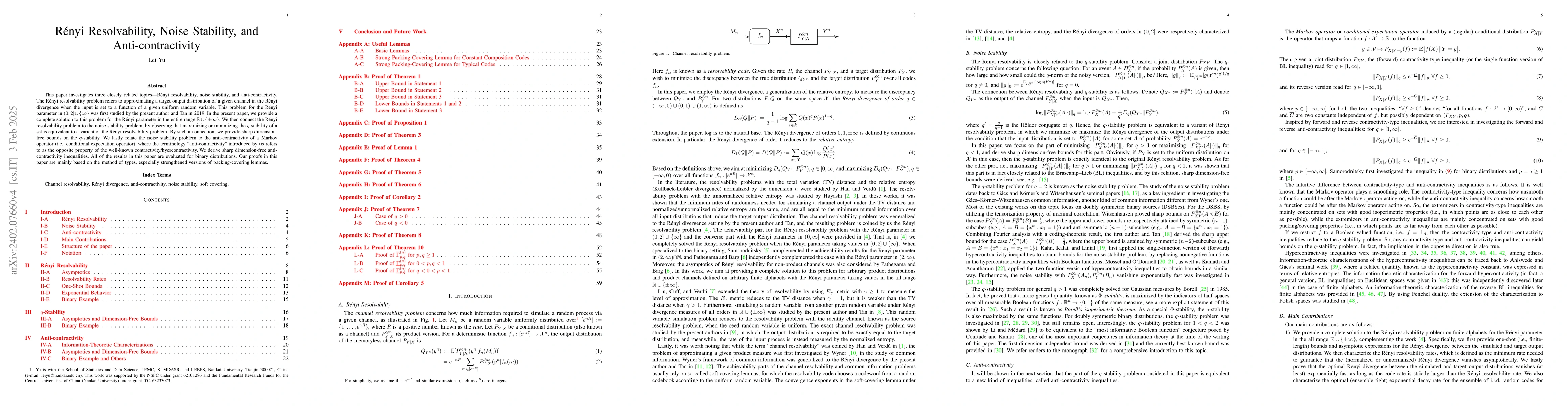 This paper provides a complete solution to the R\'enyi resolvability problem across the entire range of R\'enyi parameters, connects it to noise stability, and derives sharp dimension-free bounds. It further links noise stability to anti-contractivity of Markov operators, establishing sharp anti-contractivity inequalities, all evaluated for binary distributions.