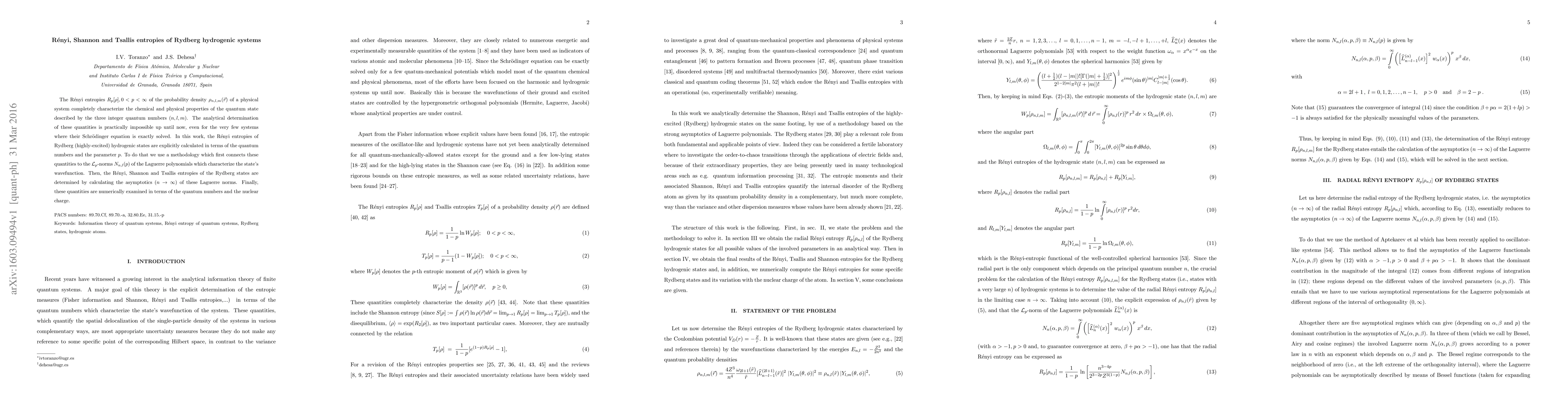 This paper calculates the R\'enyi, Shannon, and Tsallis entropies for Rydberg hydrogenic systems by connecting these quantities to the $\mathcal{L}_{p}$-norms of Laguerre polynomials, determining their asymptotics for large quantum numbers, and examining the results numerically.