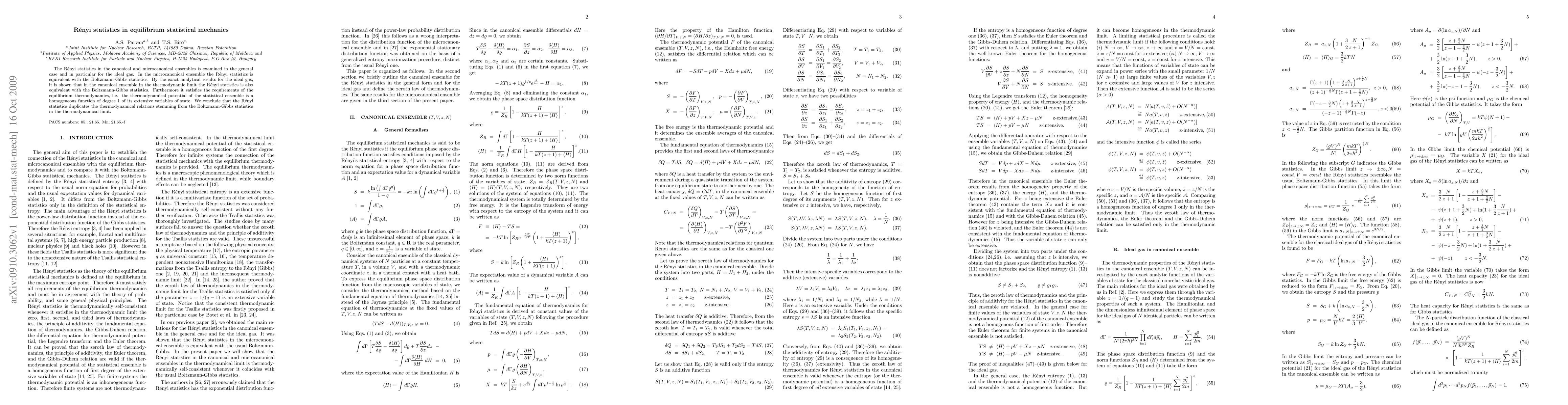 The Renyi statistics in the canonical and microcanonical ensembles is examined in the general case and in particular for the ideal gas. In the microcanonical ensemble the Renyi statistics is equivalent with the Boltzmann-Gibbs statistics. By the exact analytical results for the ideal gas, it is shown that in the canonical ensemble in the thermodynamic limit the Renyi statistics is also equivalent with the Boltzmann-Gibbs statistics. Furthermore it satisfies the requirements of the equilibrium thermodynamics, i.e. the thermodynamical potential of the statistical ensemble is a homogeneous function of degree 1 of its extensive variables of state. We conclude that the Renyi statistics duplicates the thermodynamical relations stemming from the Boltzmann-Gibbs statistics in the thermodynamical limit.