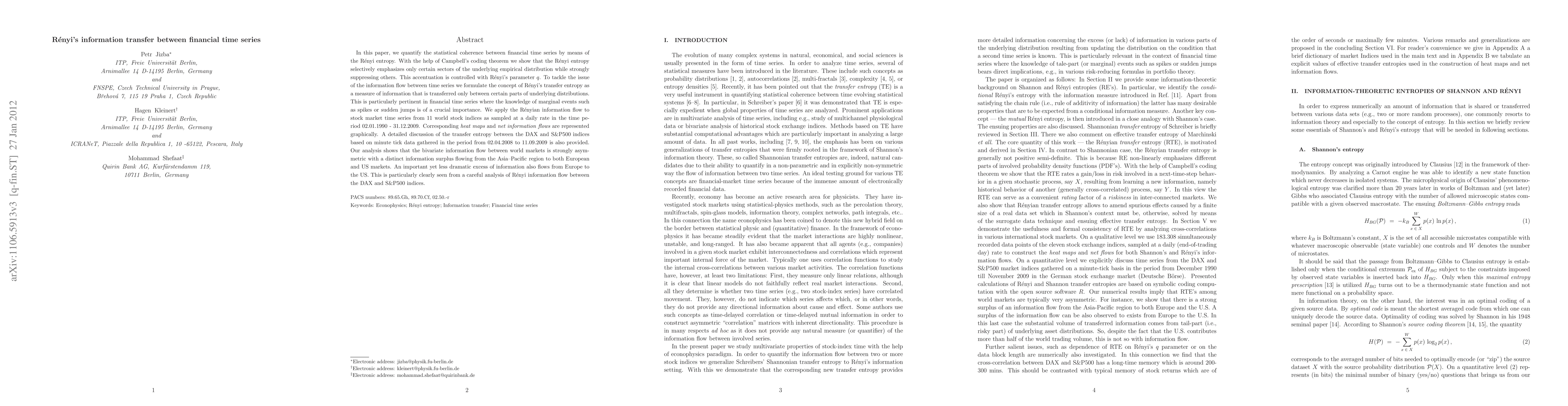 This paper uses Renyi entropy to quantify statistical coherence and information transfer between financial time series, emphasizing certain sectors of the distribution controlled by parameter q. It applies Renyi's transfer entropy to stock market indices, revealing asymmetric information flow with a significant surplus from Asia-Pacific to European and US markets.