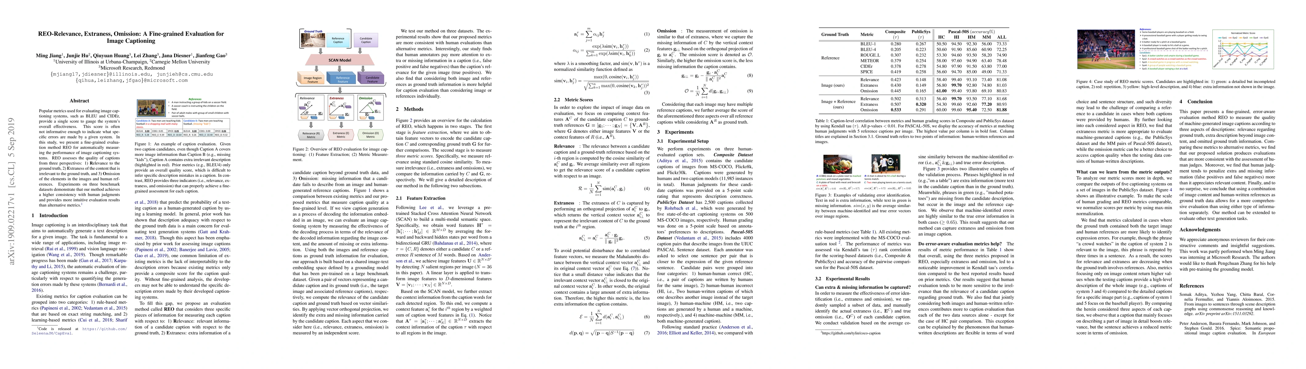 This paper introduces REO, a fine-grained evaluation method for image captioning systems, assessing captions based on relevance, extraness, and omission. Experiments show that REO provides a more consistent and intuitive evaluation compared to traditional metrics like BLEU and CIDEr.