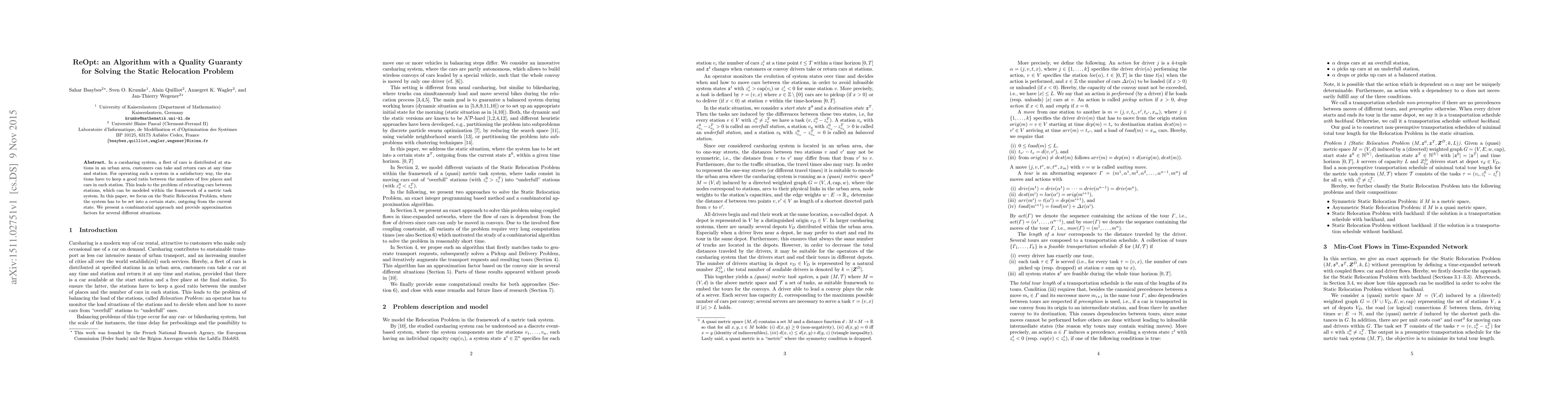 This paper introduces ReOpt, an algorithm that guarantees quality solutions for the Static Relocation Problem in carsharing systems, aiming to optimize the distribution of cars between stations to maintain an optimal ratio of free places to cars. The authors provide combinatorial approaches and approximation factors for various scenarios.