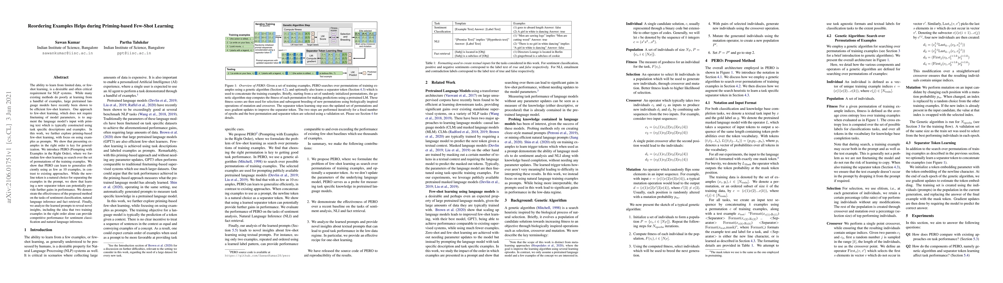 This paper explores priming-based few-shot learning using example reordering, introducing PERO, which searches for optimal example permutations to improve generalization. The method demonstrates efficient learning with minimal examples and outperforms existing approaches, showing potential gains from learning a new separator token.
