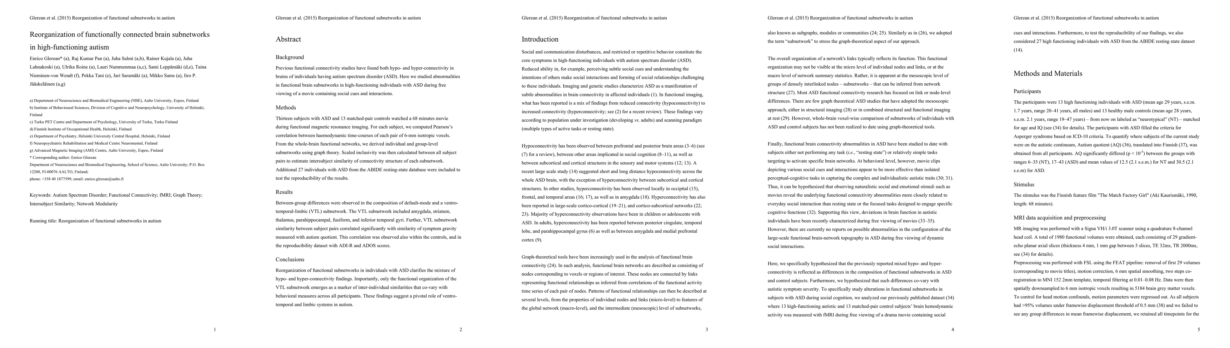 Background: Previous functional connectivity studies have found both hypo- and hyper-connectivity in brains of individuals having autism spectrum disorder (ASD). Here we studied abnormalities in functional brain subnetworks in high-functioning individuals with ASD during free viewing of a movie containing social cues and interactions. Methods: Thirteen subjects with ASD and 13 matched-pair controls watched a 68 minutes movie during functional magnetic resonance imaging. For each subject, we computed Pearson`s correlation between haemodynamic time-courses of each pair of 6-mm isotropic voxels. From the whole-brain functional networks, we derived individual and group-level subnetworks using graph theory. Scaled inclusivity was then calculated between all subject pairs to estimate intersubject similarity of connectivity structure of each subnetwork. Additional 27 individuals with ASD from the ABIDE resting-state database were included to test the reproducibility of the results. Results: Between-group differences were observed in the composition of default-mode and a ventro-temporal-limbic (VTL) subnetwork. The VTL subnetwork included amygdala, striatum, thalamus, parahippocampal, fusiform, and inferior temporal gyri. Further, VTL subnetwork similarity between subject pairs correlated significantly with similarity of symptom gravity measured with autism quotient. This correlation was observed also within the controls, and in the reproducibility dataset with ADI-R and ADOS scores. Conclusions: Reorganization of functional subnetworks in individuals with ASD clarifies the mixture of hypo- and hyper-connectivity findings. Importantly, only the functional organization of the VTL subnetwork emerges as a marker of inter-individual similarities that co-vary with behavioral measures across all participants. These findings suggest a pivotal role of ventro-temporal and limbic systems in autism.