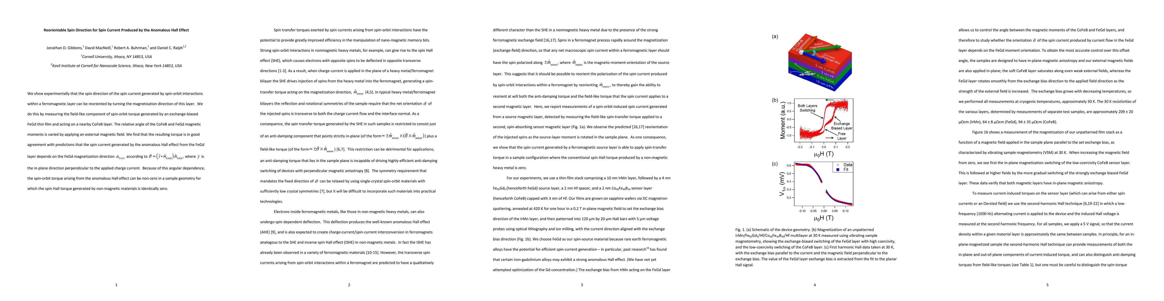 This study experimentally demonstrates that the spin direction of spin current from the anomalous Hall effect in a ferromagnetic layer can be reoriented by altering the magnetization direction. This effect is measured through spin-orbit torque in an exchange-biased FeGd/CoFeB thin film system, showing a torque dependent on the FeGd magnetization direction.