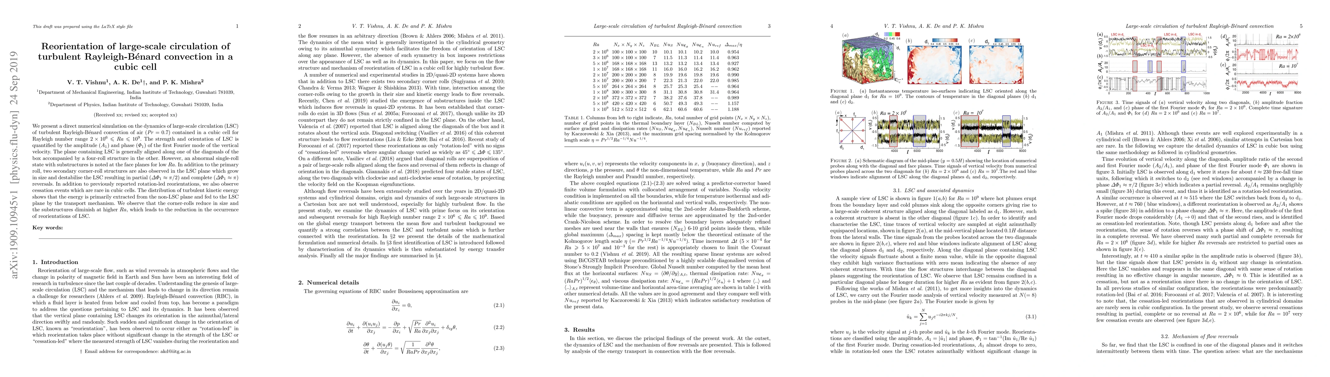 This paper investigates the dynamics of large-scale circulation in turbulent Rayleigh-Bénard convection within a cubic cell, revealing reorientation phenomena and the presence of secondary corner-rolls that destabilize the primary circulation. The study highlights the transition from a four-roll to a single-roll state and the reduction of reorientation events at higher Rayleigh numbers.