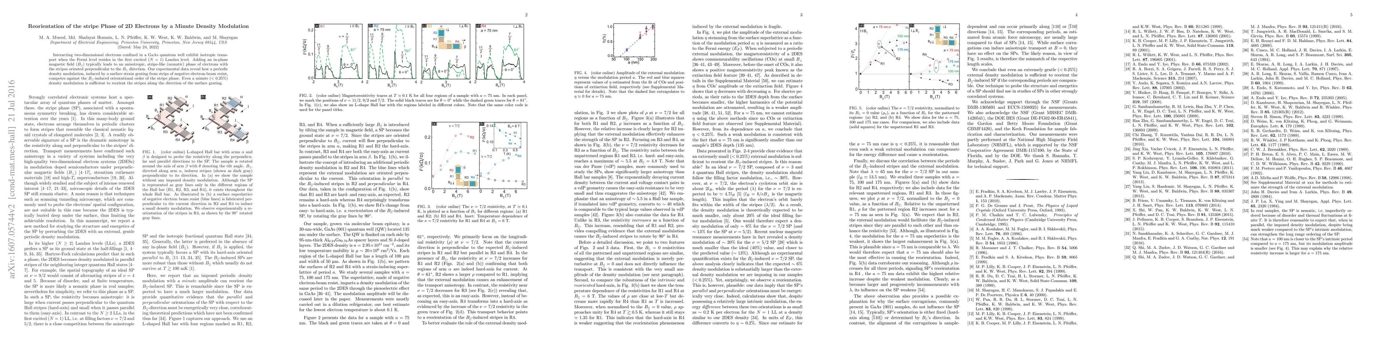 Interacting two-dimensional electrons confined in a GaAs quantum well exhibit isotropic transport when the Fermi level resides in the first excited ($N=1$) Landau level. Adding an in-plane magnetic field ($B_{||}$) typically leads to an anisotropic, stripe-like (nematic) phase of electrons with the stripes oriented perpendicular to the $B_{||}$ direction. Our experimental data reveal how a periodic density modulation, induced by a surface strain grating from strips of negative electron-beam resist, competes against the $B_{||}$-induced orientational order of the stripe phase. Even a minute ($<0.25\%$) density modulation is sufficient to reorient the stripes along the direction of the surface grating.