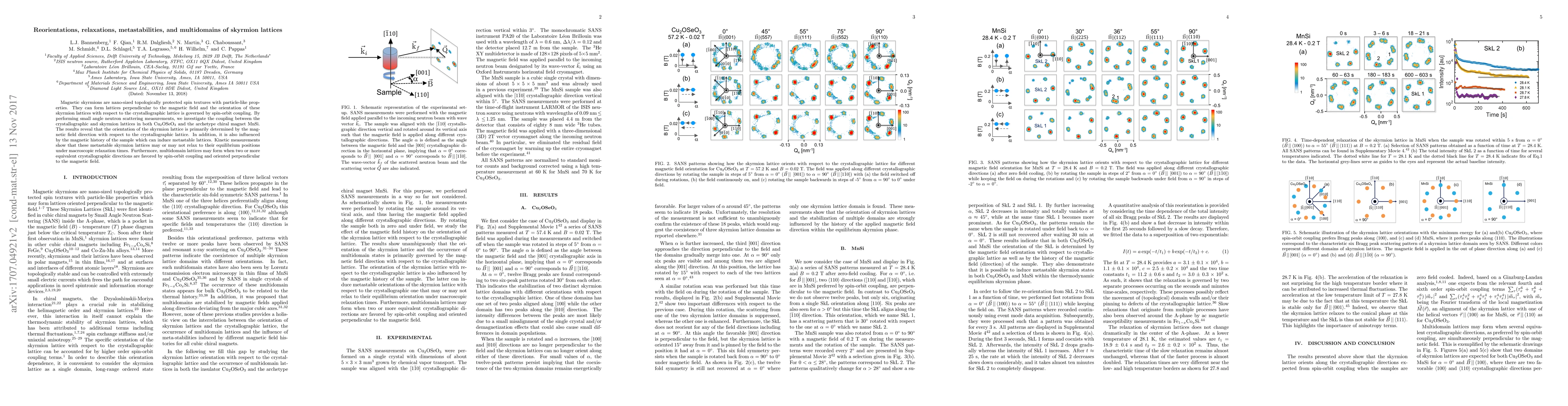 Magnetic skyrmions are nano-sized topologically protected spin textures with particle-like properties. They can form lattices perpendicular to the magnetic field and the orientation of these skyrmion lattices with respect to the crystallographic lattice is governed by spin-orbit coupling. By performing small angle neutron scattering measurements, we investigate the coupling between the crystallographic and skyrmion lattices in both Cu$_2$OSeO$_3$ and the archetype chiral magnet MnSi. The results reveal that the orientation of the skyrmion lattice is primarily determined by the magnetic field direction with respect to the crystallographic lattice. In addition, it is also influenced by the magnetic history of the sample which can induce metastable lattices. Kinetic measurements show that these metastable skyrmion lattices may or may not relax to their equilibrium positions under macroscopic relaxation times. Furthermore, multidomain lattices may form when two or more equivalent crystallographic directions are favored by spin-orbit coupling and oriented perpendicular to the magnetic field.