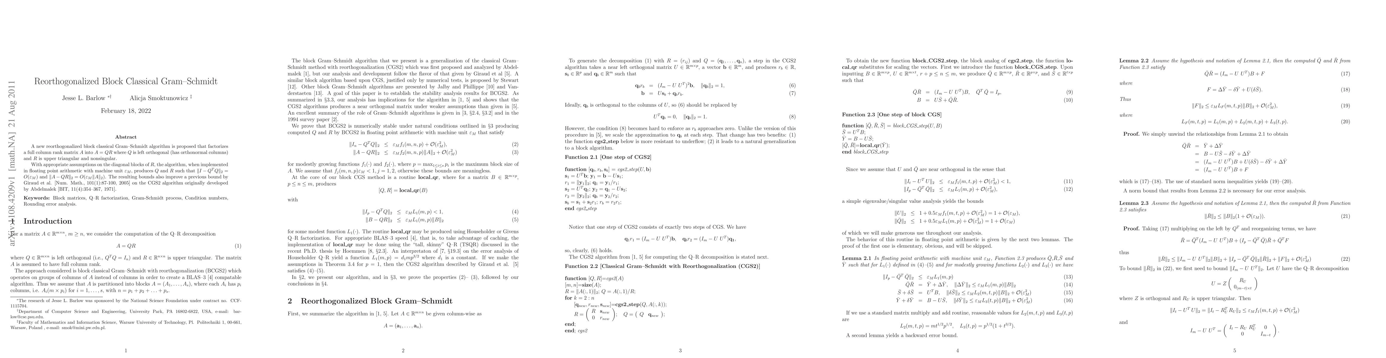 This paper introduces a new reorthogonalized block classical Gram-Schmidt algorithm for factorizing a full column rank matrix into $QR$ form, achieving improved error bounds over previous methods. The algorithm maintains orthogonality and minimizes rounding errors in floating point arithmetic.