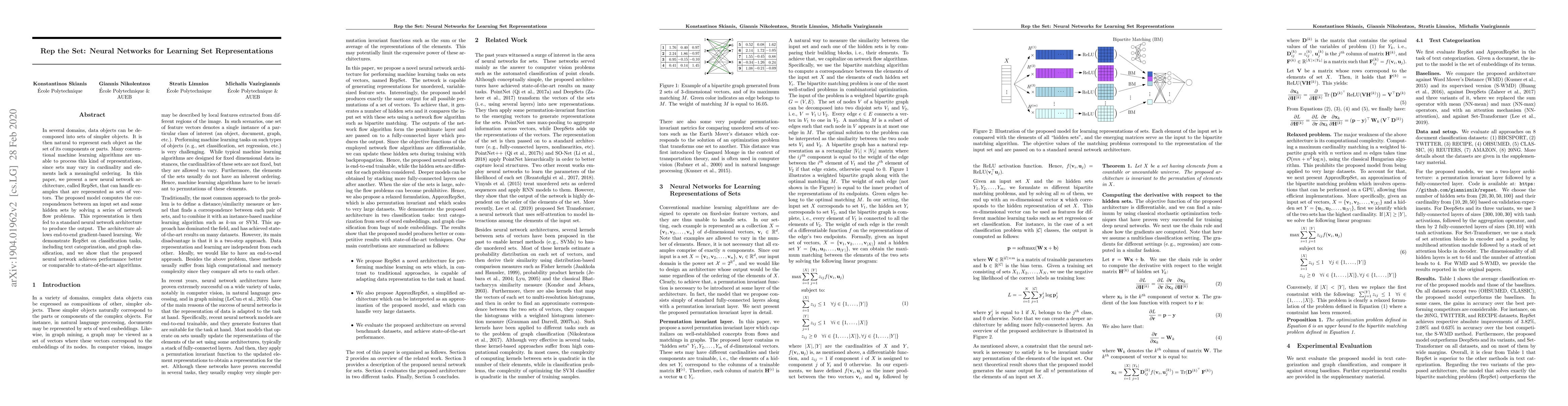 In several domains, data objects can be decomposed into sets of simpler objects. It is then natural to represent each object as the set of its components or parts. Many conventional machine learning algorithms are unable to process this kind of representations, since sets may vary in cardinality and elements lack a meaningful ordering. In this paper, we present a new neural network architecture, called RepSet, that can handle examples that are represented as sets of vectors. The proposed model computes the correspondences between an input set and some hidden sets by solving a series of network flow problems. This representation is then fed to a standard neural network architecture to produce the output. The architecture allows end-to-end gradient-based learning. We demonstrate RepSet on classification tasks, including text categorization, and graph classification, and we show that the proposed neural network achieves performance better or comparable to state-of-the-art algorithms.
