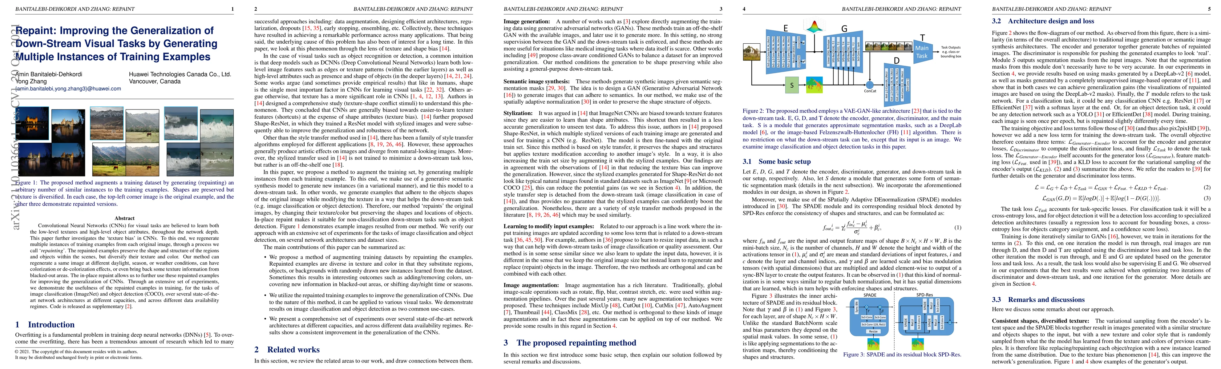 Convolutional Neural Networks (CNNs) for visual tasks are believed to learn both the low-level textures and high-level object attributes, throughout the network depth. This paper further investigates the `texture bias' in CNNs. To this end, we regenerate multiple instances of training examples from each original image, through a process we call `repainting'. The repainted examples preserve the shape and structure of the regions and objects within the scenes, but diversify their texture and color. Our method can regenerate a same image at different daylight, season, or weather conditions, can have colorization or de-colorization effects, or even bring back some texture information from blacked-out areas. The in-place repaint allows us to further use these repainted examples for improving the generalization of CNNs. Through an extensive set of experiments, we demonstrate the usefulness of the repainted examples in training, for the tasks of image classification (ImageNet) and object detection (COCO), over several state-of-the-art network architectures at different capacities, and across different data availability regimes.