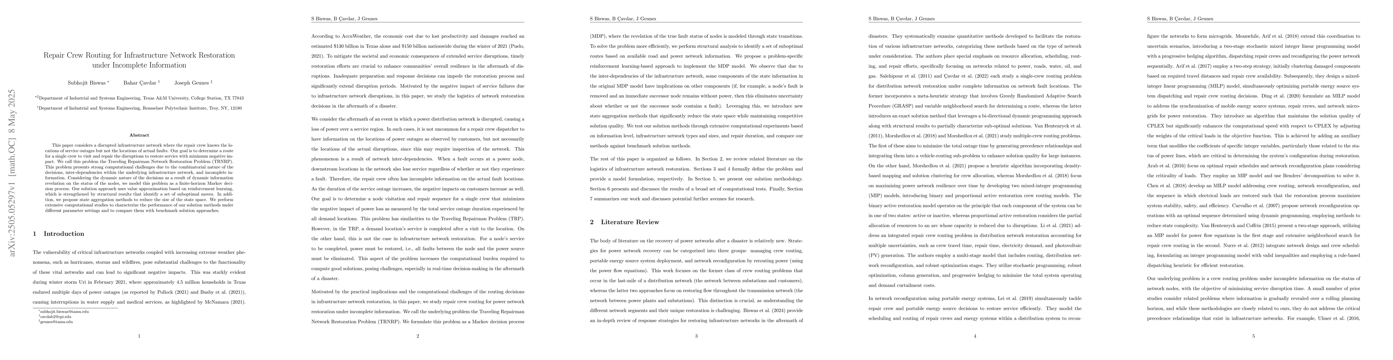 This paper addresses the Traveling Repairman Network Restoration Problem (TRNRP) in disrupted infrastructure networks, where repair crews must restore service with minimal impact under incomplete fault information. The authors propose a reinforcement learning-based solution approach and state aggregation methods to manage the problem's complexity, followed by extensive computational studies to evaluate performance.