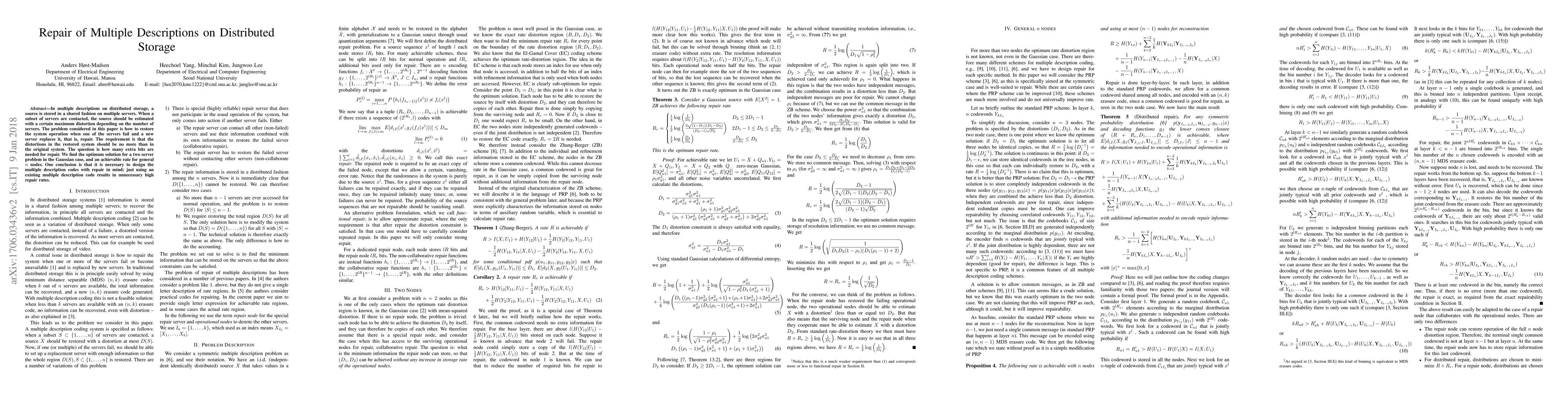 In multiple descriptions on distributed storage, a source is stored in a shared fashion on multiple servers. When a subset of servers are contacted, the source should be estimated with a certain maximum distortion depending on the number of servers. The problem considered in this paper is how to restore the system operation when one of the servers fail and a new server replaces it, that is, repair. The requirement is that the distortions in the restored system should be no more than in the original system. The question is how many extra bits are needed for repair. We find the optimum solution for a two server problem in the Gaussian case, and an achievable rate for general $n$ nodes. One conclusion is that it is necessary to design the multiple description codes with repair in mind; just using an existing multiple description code results in unnecessary high repair rates.