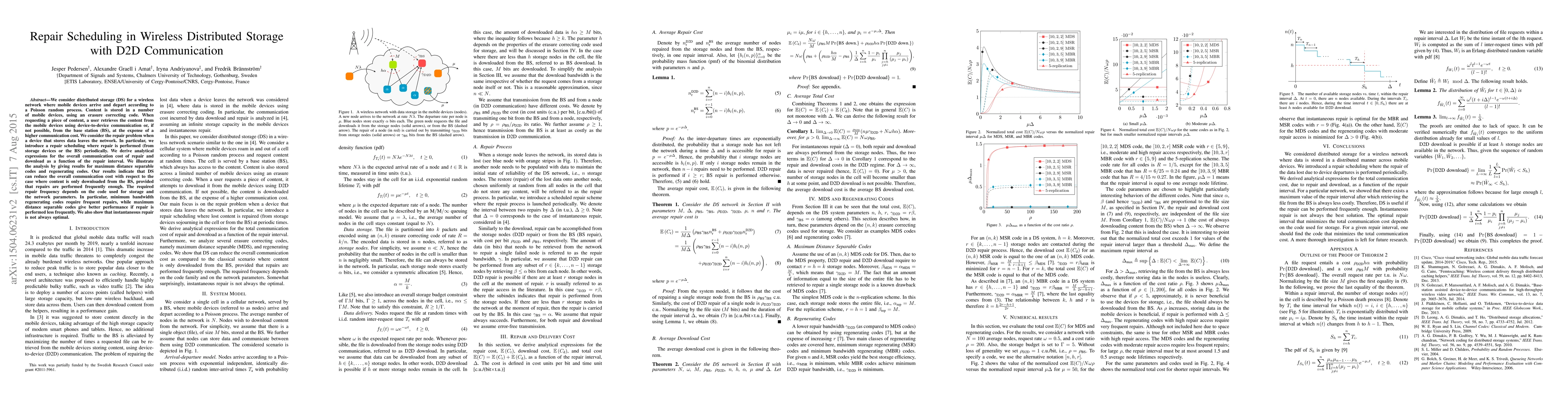 This paper studies a wireless distributed storage system where mobile devices store and repair data using device-to-device communication. It finds that frequent repairs can reduce overall communication cost, but the required frequency depends on the used code and network parameters.