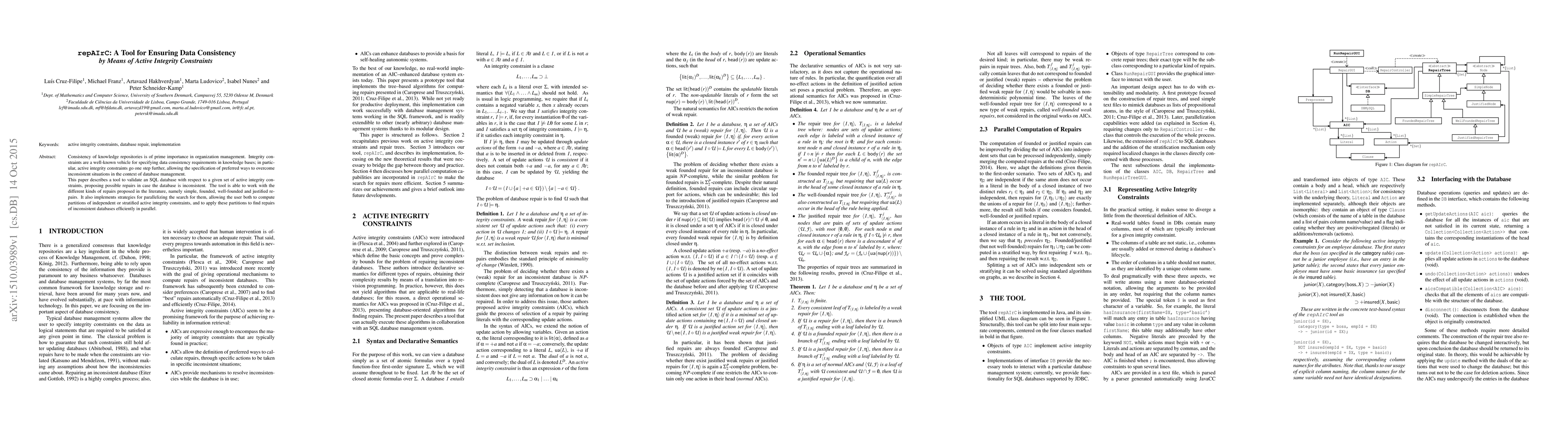Consistency of knowledge repositories is of prime importance in organization management. Integrity constraints are a well-known vehicle for specifying data consistency requirements in knowledge bases; in particular, active integrity constraints go one step further, allowing the specification of preferred ways to overcome inconsistent situations in the context of database management. This paper describes a tool to validate an SQL database with respect to a given set of active integrity constraints, proposing possible repairs in case the database is inconsistent. The tool is able to work with the different kinds of repairs proposed in the literature, namely simple, founded, well-founded and justified repairs. It also implements strategies for parallelizing the search for them, allowing the user both to compute partitions of independent or stratified active integrity constraints, and to apply these partitions to find repairs of inconsistent databases efficiently in parallel.