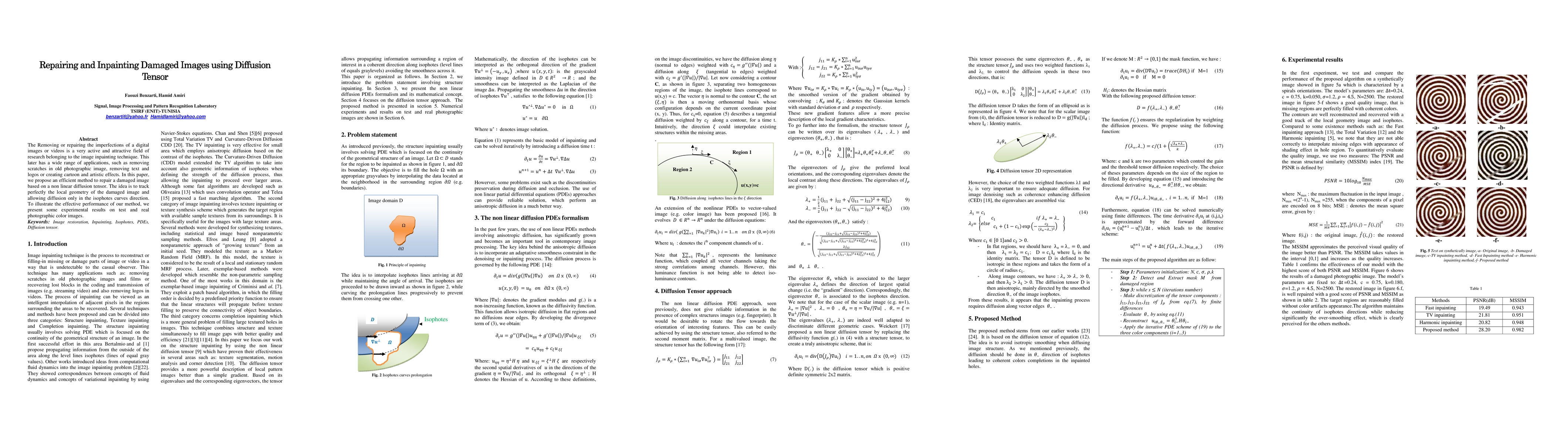 This paper proposes a method to repair damaged images using diffusion tensor, tracking local geometry and allowing only diffusion in isophotes curves direction.