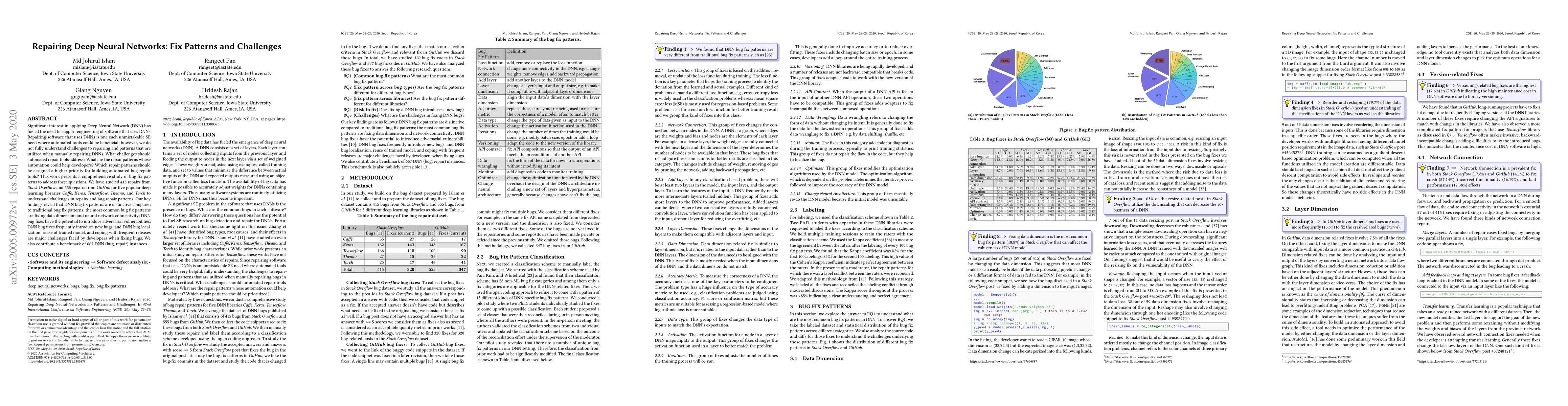 This study investigates repair patterns and challenges in fixing bugs in Deep Neural Networks (DNNs) by analyzing 970 repairs from Stack Overflow and GitHub. Key findings highlight unique DNN bug fix patterns, such as fixing data dimensions and network connectivity, and emphasize challenges like adversarial vulnerabilities, frequent new bug introductions, and difficulties in localization and reuse of trained models.