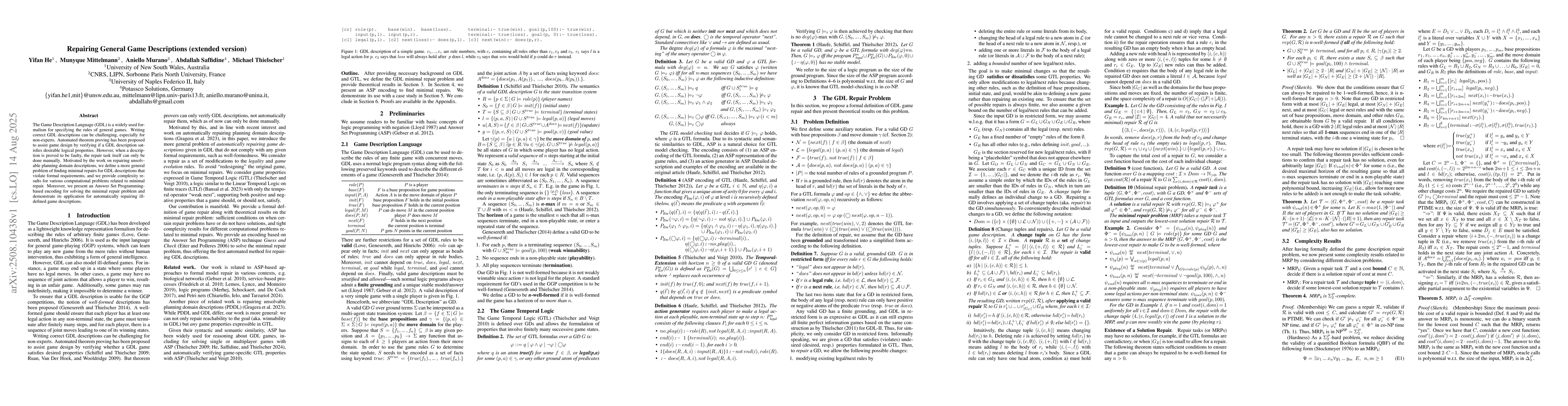 The Game Description Language (GDL) is a widely used formalism for specifying the rules of general games. Writing correct GDL descriptions can be challenging, especially for non-experts. Automated theorem proving has been proposed to assist game design by verifying if a GDL description satisfies desirable logical properties. However, when a description is proved to be faulty, the repair task itself can only be done manually. Motivated by the work on repairing unsolvable planning domain descriptions, we define a more general problem of finding minimal repairs for GDL descriptions that violate formal requirements, and we provide complexity results for various computational problems related to minimal repair. Moreover, we present an Answer Set Programming-based encoding for solving the minimal repair problem and demonstrate its application for automatically repairing ill-defined game descriptions.