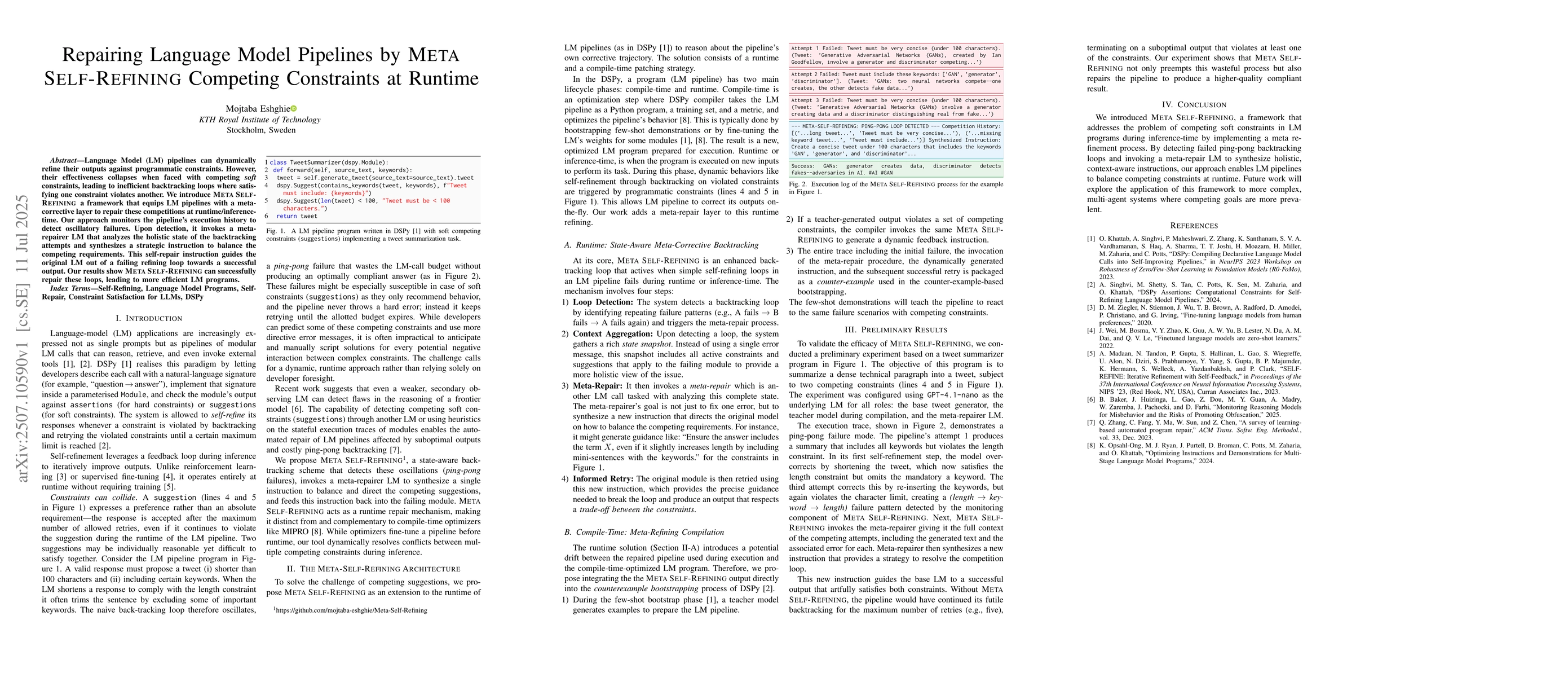 Language Model (LM) pipelines can dynamically refine their outputs against programmatic constraints. However, their effectiveness collapses when faced with competing soft constraints, leading to inefficient backtracking loops where satisfying one constraint violates another. We introduce Meta Self-Refining, a framework that equips LM pipelines with a meta-corrective layer to repair these competitions at runtime/inference-time. Our approach monitors the pipeline's execution history to detect oscillatory failures. Upon detection, it invokes a meta-repairer LM that analyzes the holistic state of the backtracking attempts and synthesizes a strategic instruction to balance the competing requirements. This self-repair instruction guides the original LM out of a failing refining loop towards a successful output. Our results show Meta Self-Refining can successfully repair these loops, leading to more efficient LM programs.