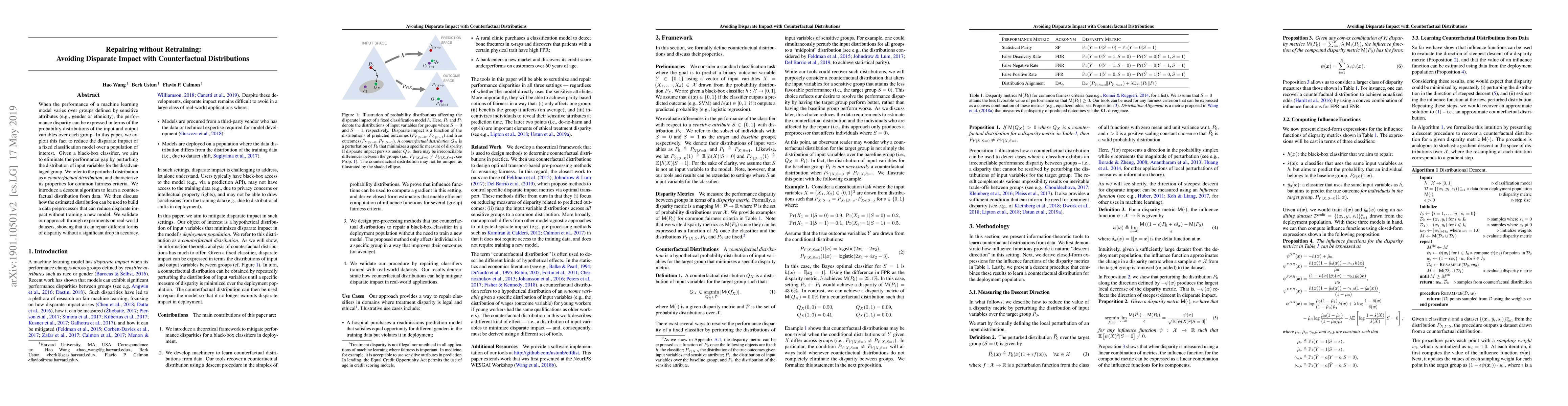 When the performance of a machine learning model varies over groups defined by sensitive attributes (e.g., gender or ethnicity), the performance disparity can be expressed in terms of the probability distributions of the input and output variables over each group. In this paper, we exploit this fact to reduce the disparate impact of a fixed classification model over a population of interest. Given a black-box classifier, we aim to eliminate the performance gap by perturbing the distribution of input variables for the disadvantaged group. We refer to the perturbed distribution as a counterfactual distribution, and characterize its properties for common fairness criteria. We introduce a descent algorithm to learn a counterfactual distribution from data. We then discuss how the estimated distribution can be used to build a data preprocessor that can reduce disparate impact without training a new model. We validate our approach through experiments on real-world datasets, showing that it can repair different forms of disparity without a significant drop in accuracy.