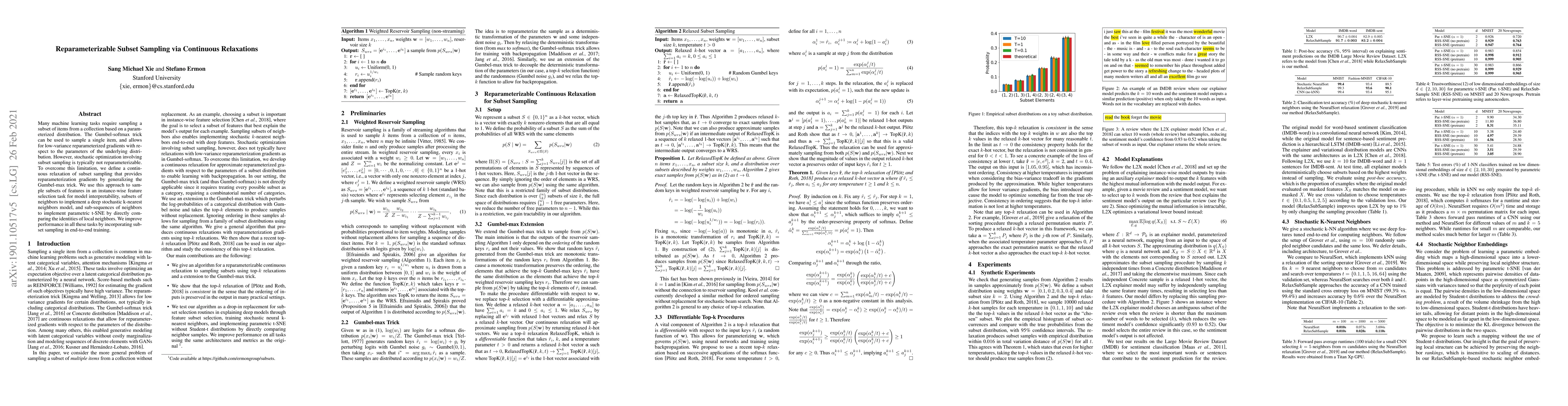 The paper introduces a continuous relaxation of subset sampling using the Gumbel-max trick, extending reparameterizable gradients to tasks involving subset sampling such as feature selection, deep stochastic k-nearest neighbors, and parametric t-SNE.