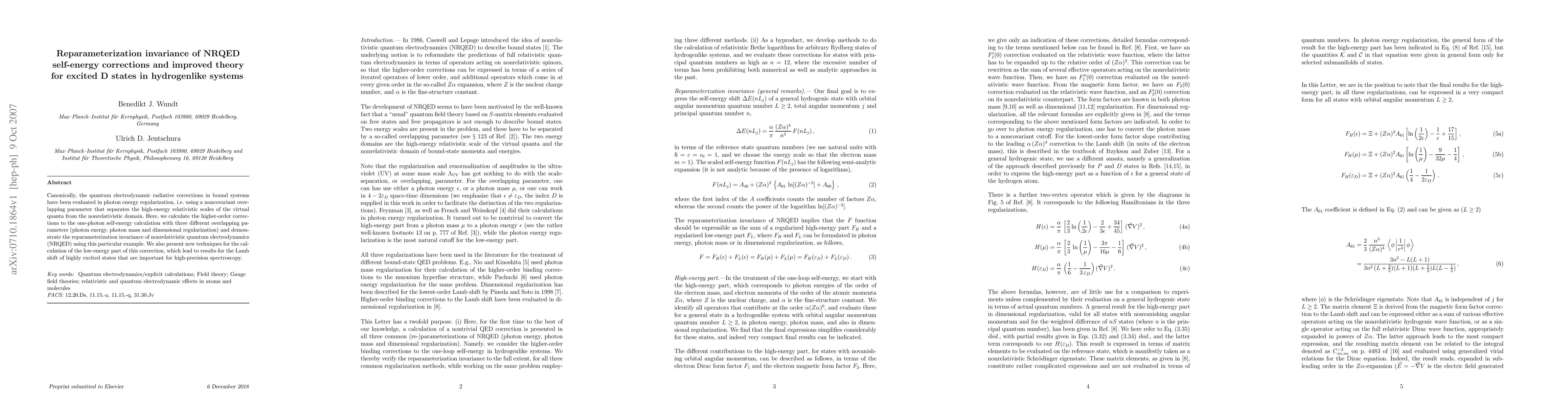 The paper presents a detailed analysis of reparameterization invariance in NRQED self-energy corrections for excited D states in hydrogen-like systems, introducing new techniques for low-energy part calculations.