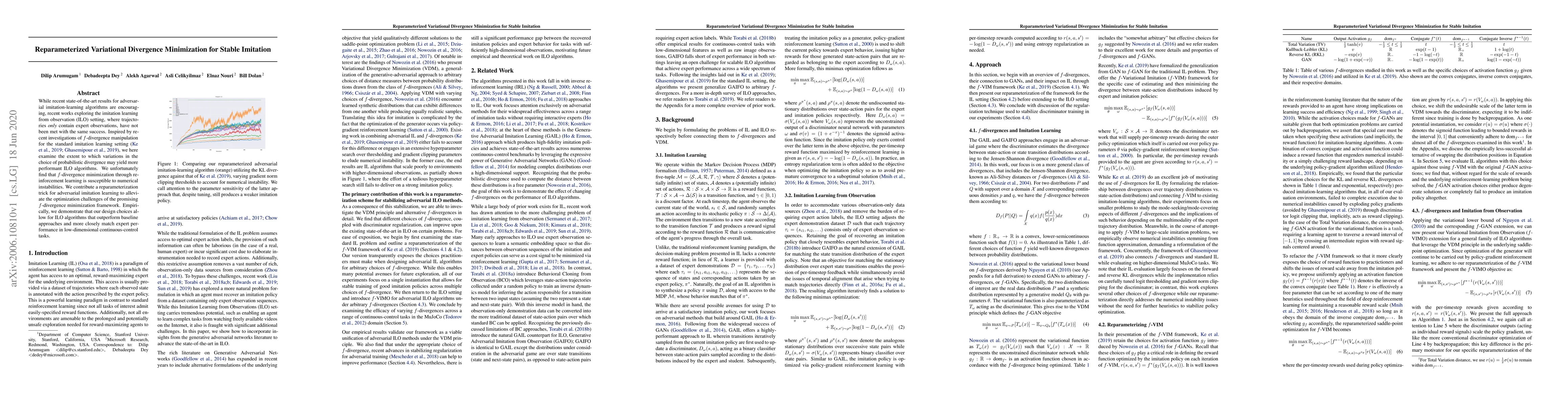 This paper proposes a reparameterized variational divergence minimization approach to stabilize adversarial imitation learning from observation (ILO). Despite the potential of $f$-divergence minimization, it faces numerical instability issues. The introduced reparameterization technique addresses these challenges, leading to ILO algorithms that outperform baselines and better match expert performance in low-dimensional control tasks.